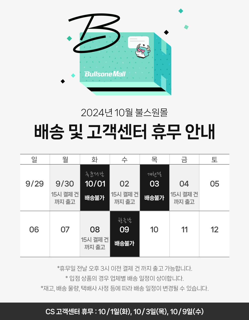 불스원몰 10월 연휴 배송 및 고객센터 휴무 안내
