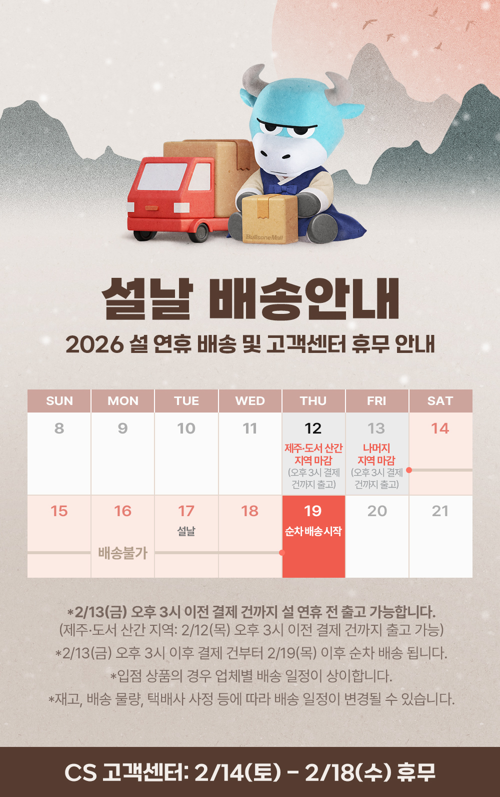 [불스원몰] 설연휴 배송 및 고객센터 휴무 안내
