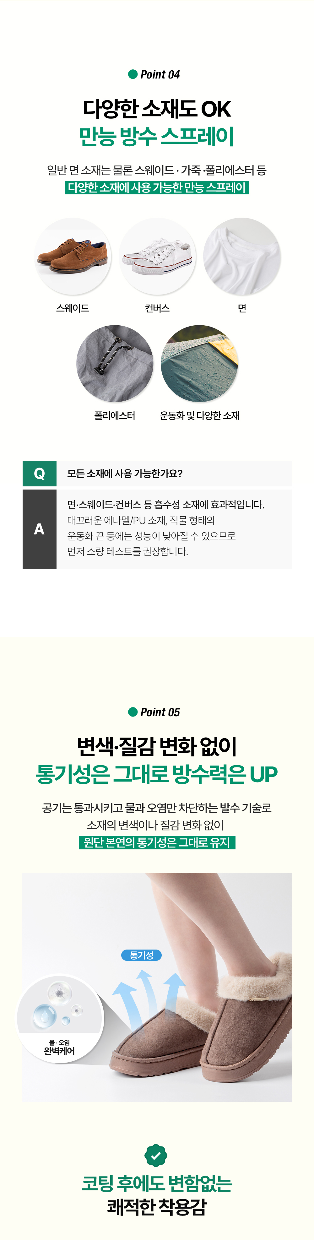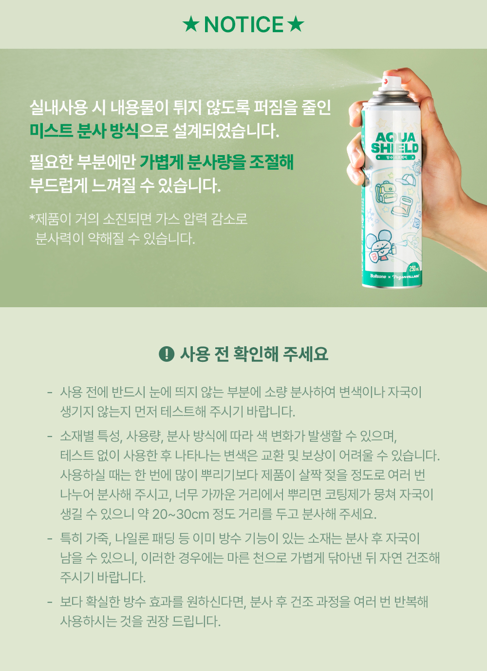 | 9. 사용상 주의사항 | •너무 가까이 뿌릴 경우 얼룩이 생길 수 있음. •습도가 높은 환경에서는 사용 간격을 늘려 주시오. •가죽 및 나일론, 패딩 등 이미 방수 기능이 있는 경우에는 분사 후 코팅제의 자국이 남을 수 있음. 이러한 경우 마른 천으로 가볍게 닦은 후 건조시켜 주시오. •드라이어로 건조 시, 뜨겁지 않은 바람 으로 건조시켜 주시오. •주변에 불꽃(Spark)이 발생되는지 확인하고, 일정량을 분사한 후 가스가 흩어지는 시간을 기다렸다가 다시 사용하시오 •직사 광선이나 열기에 노출 시 폭발할 수 있으니 주의하시오 •어린이보호포장이 적용되지 아니한 제품으로 어린이의 손이 닿지 않는 곳에 보관하시오 ※ 직사광선이나 열기에 노출시키지 마십시오. 【응급처치】 ·피부자극 반응 또는 붉은 반점이 나타나면 의학적 조치를 받으시오. |