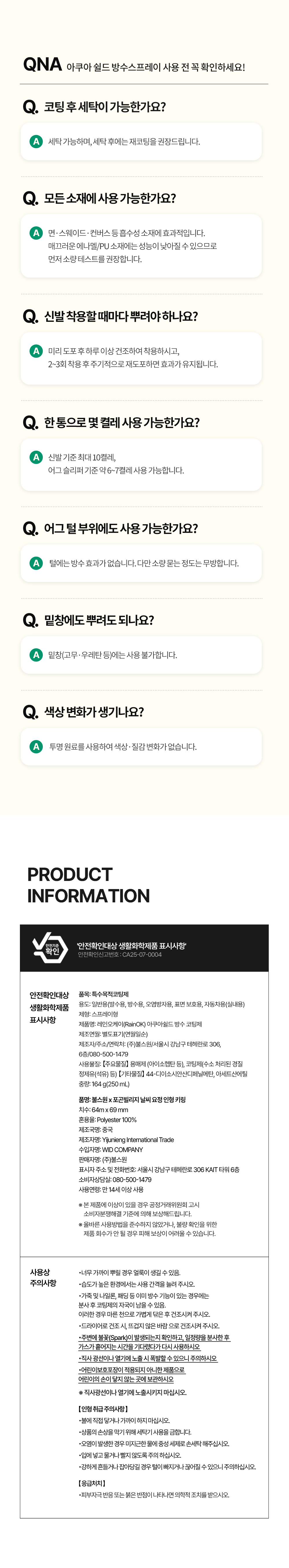 | 10. 안전기준 적합확인 신고번호(자가검사번호) 또는 안전확인대상 생활화학제품 승인번호 | [방수스프레이] CA25-07-0004 |