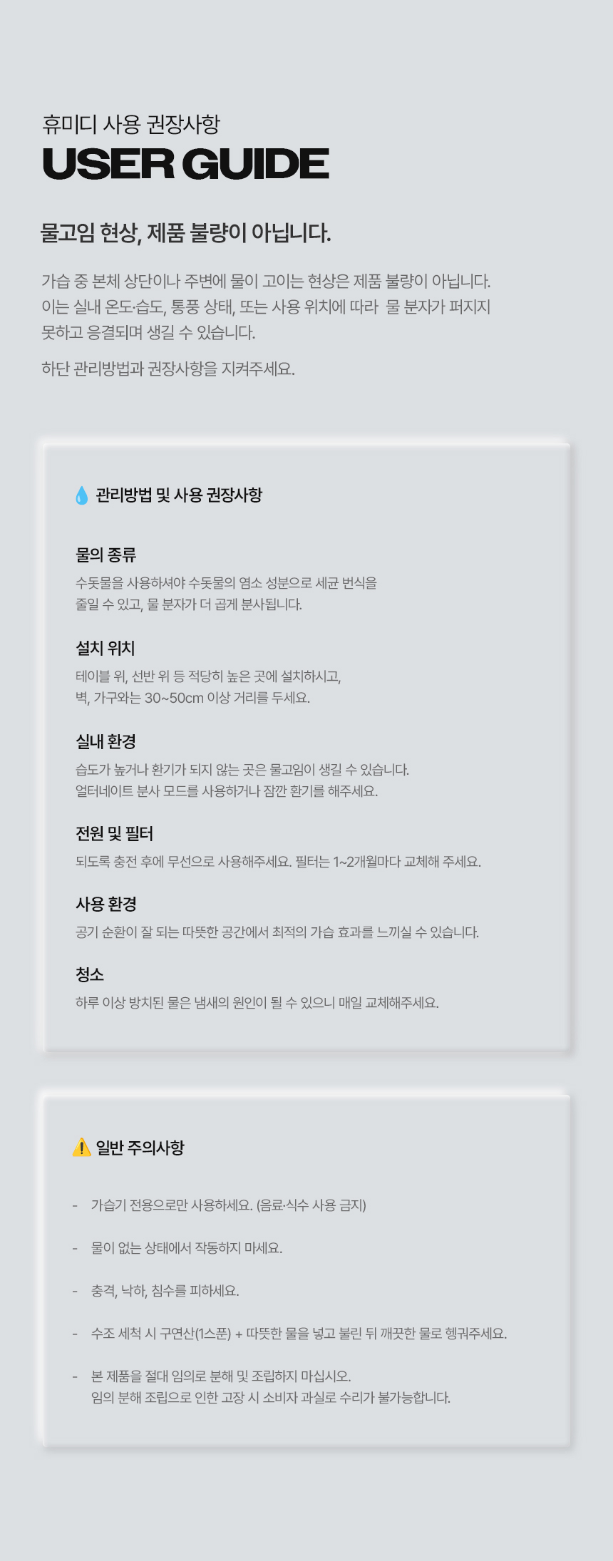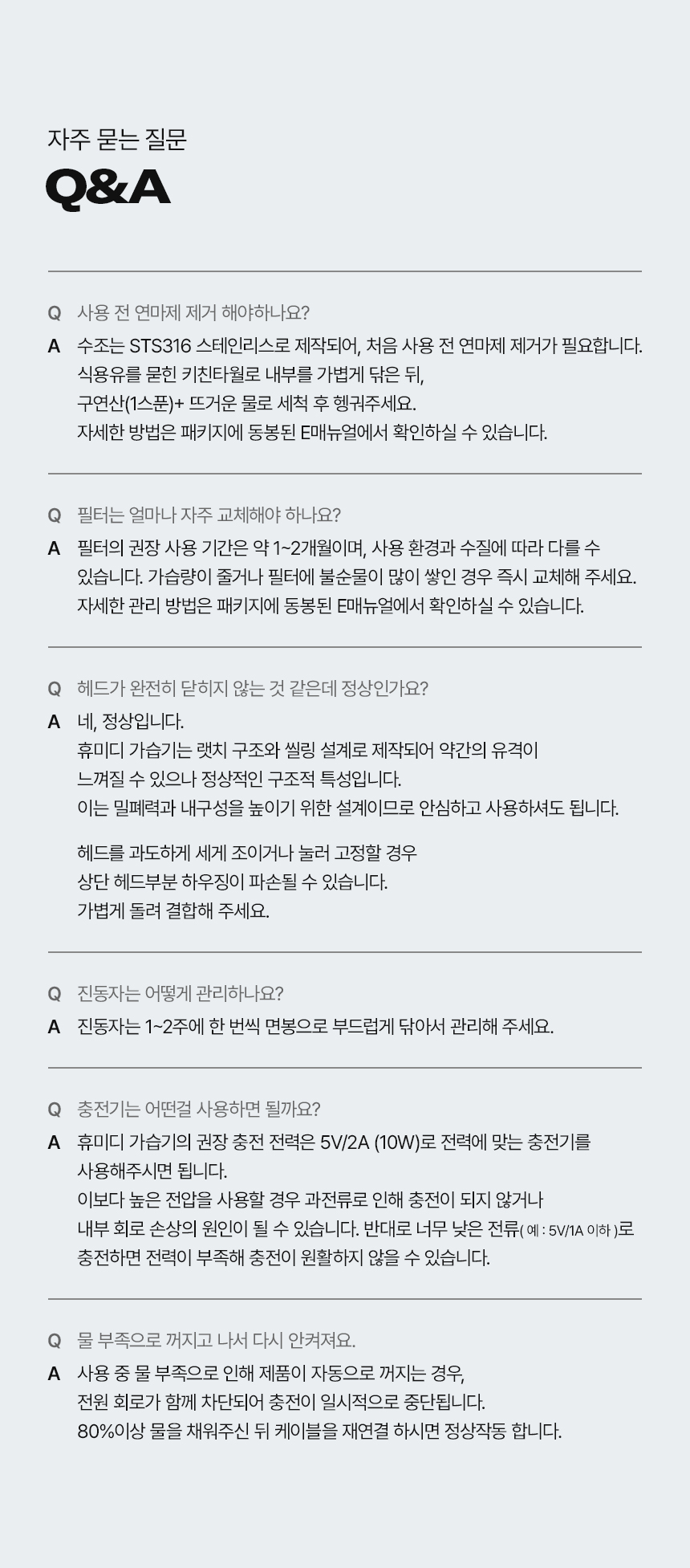 | 9. 품질보증기준 | ※ 본 제품에 이상이 있을 경우 공정거래위원회 고시 소비자 분쟁해결 기준에 의해 보상해드립니다. ※ 올바른 사용방법을 준수하지 않았거나, 불량 확인을 위한 제품 회수가 안 될 경우 피해 보상이 어려울 수 있습니다. |