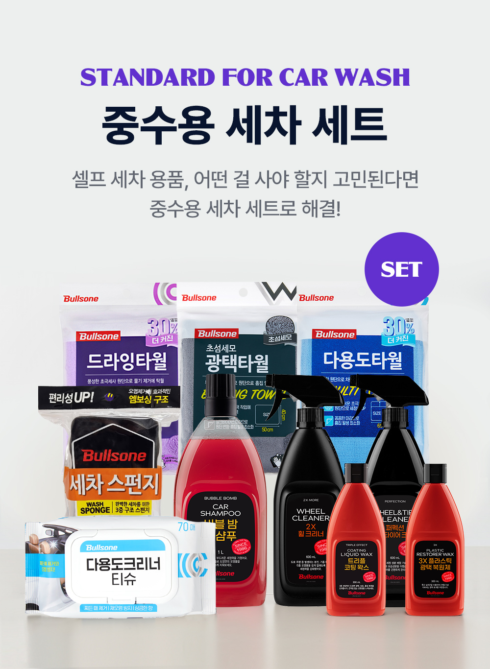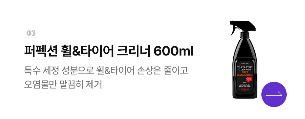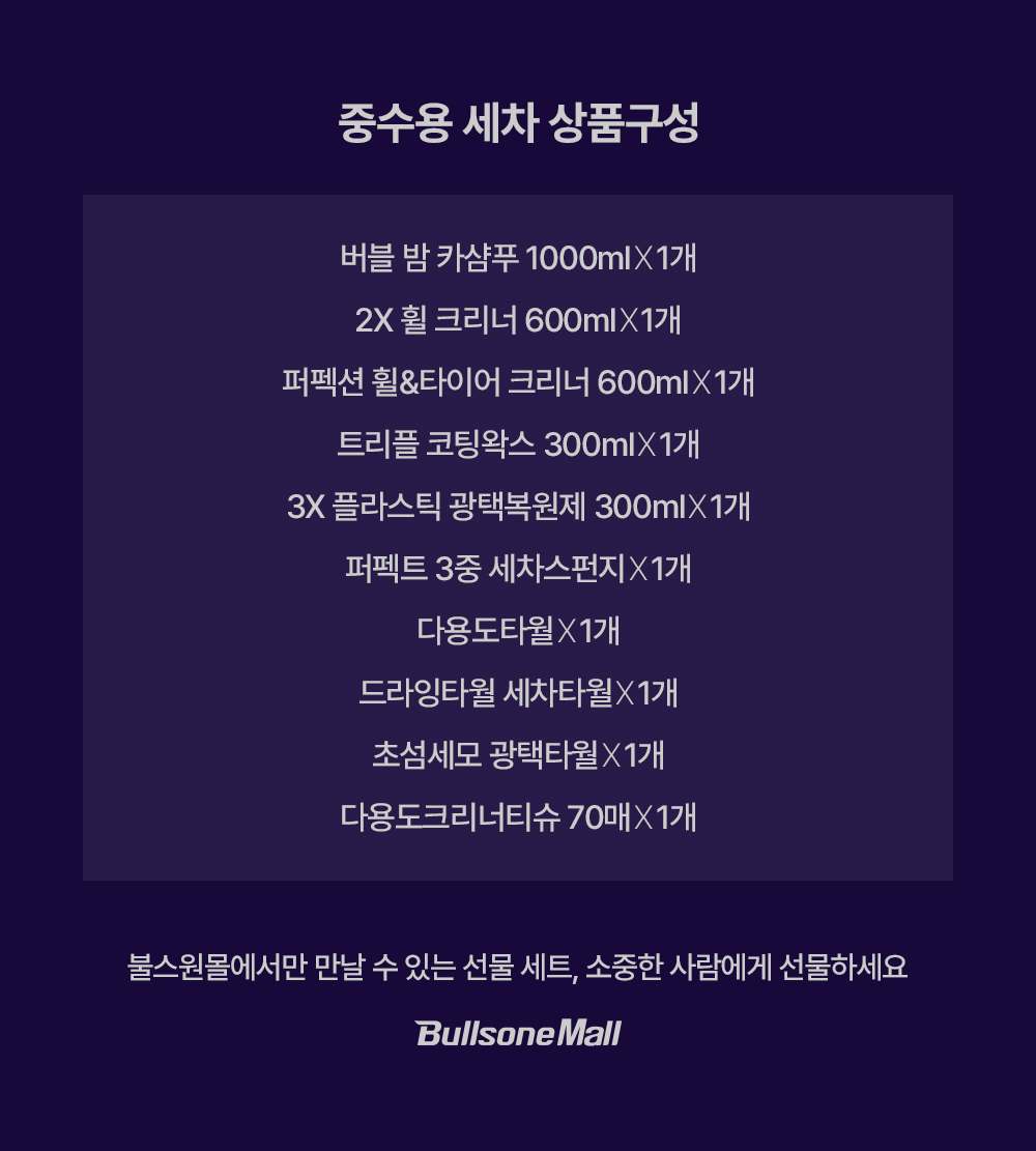 | 4. 중량·용량·매수 | [버블밤카샴푸] 1000ml [퍼펙션휠타이어크리너] 600ml [2x 휠크리너] 600ml [트리플코팅왁스] 300ml [3x플라스틱광택복원제] 300ml [다용도티슈] 70매 |