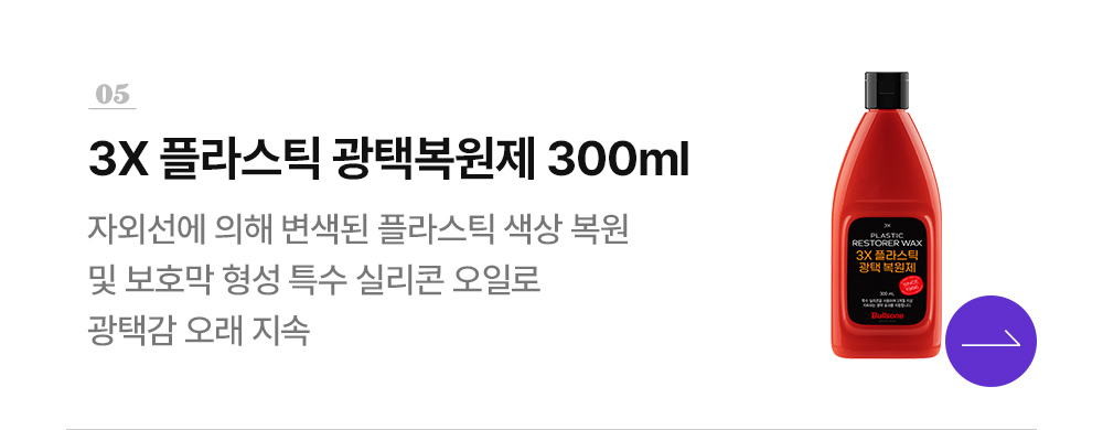 | 2. 용도(표백제의 경우 계열을 함께 표시) 및 제형 | [버블밤카샴푸] •용도:자동차용(외부용) •제형: 액체형 [퍼펙션휠타이어크리너] •용도: 자동차용(외부용) •제형: 분무기형 [2x휠크리너] •용도: 자동차용(외부용) •제형: 분무기형 [트리플코팅왁스] 용도: 광택코팅제[자동차용(외부용)], 특수목적코팅제[일반용(오염방지용, 표면 보호용), 자동차용(외부용)] / 에멀션형 [3x플라스틱광택복원제] 광택코팅제[일반용(플라스틱용), 자동차용(실내용)], 특수목적코팅제[일반용(오염방지용, 표면보호용), 자동차용(실내용)] / 에멀전형 [다용도티슈] 세정제[일반용(오븐용, 렌지후드용, 욕실용, 변기용, 건물바닥용)자동차용(실내용)], 특수목적코팅제[일반용(오염방지용, 정전기방지용, 표면보호용), 자동차용(실내용)] |