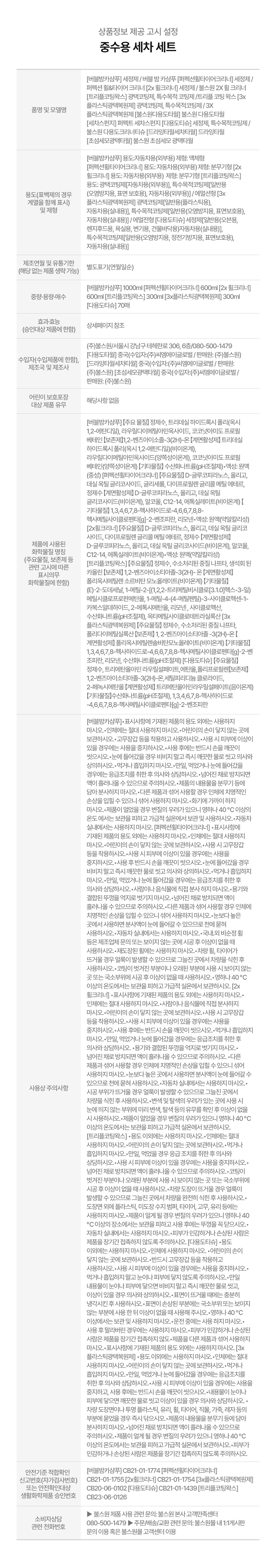 | 10. 안전기준 적합확인 신고번호(자가검사번호) 또는 안전확인대상 생활화학제품 승인번호 | [버블밤카샴푸] CB21-01-1774 [퍼펙션휠타이어크리너] CB21-01-1755 [2x휠크리너] CB21-01-1754 [3x플라스틱광택복원제] CB20-06-0102 [다용도티슈] CB21-01-1439 [트리플코팅왁스] CB23-06-0126 |