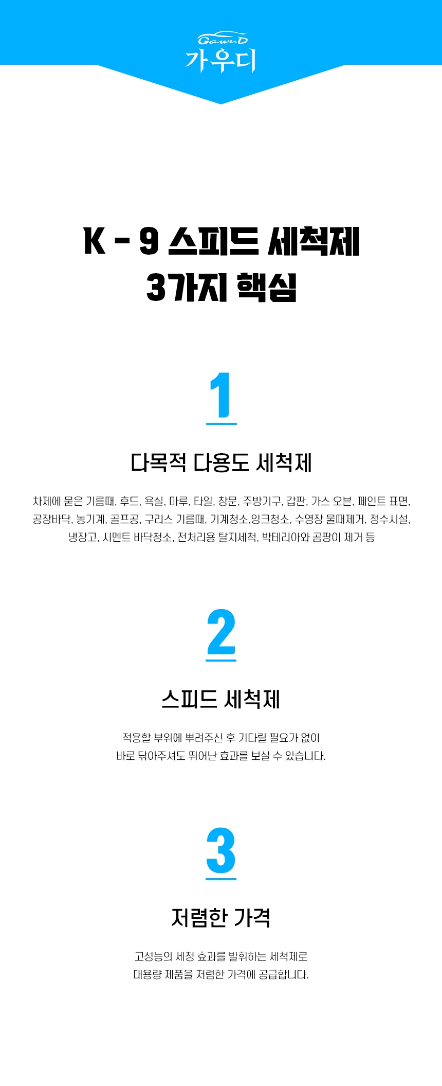 | 2. 용도(표백제의 경우 계열을 함께 표시) 및 제형 | 세정제 - 자동차용(외부용), 일반용(기타표면세정용(자전거용,오토바이용,선박용)), 제거제 - 자동차용(외부용), 일반용(기타제거용(녹제거용(자전거용,오토바이용,선박용)) / 분무기형, 보충형(분무기형) |