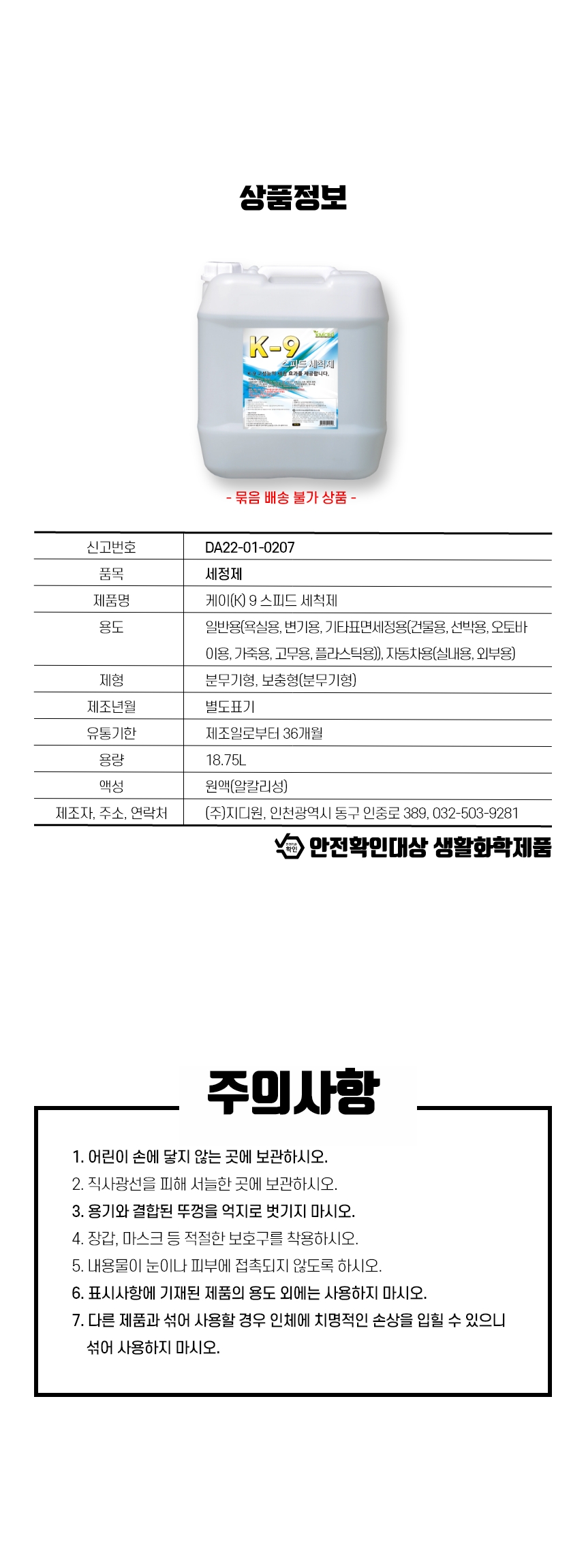 | 9. 사용상 주의사항 | 자동차실내에서는 사용하지 마시오 적용부위에 열을 완전히 식혀주시오 표시사항에 기재된 제품의 용도 외에는 사용하지 마시오 사람에게 직접 뿌리거나 분사되는 내용물을 흡입 또는 마시지 마시오 피부가 민감하거나 손상된 사람은 제품을 장기간 접촉하지 않도록 주의하시오 다른 제품과 섞어 사용할 경우 인체에 치명적인 손상을 입힐 수 있으니 섞어 사용하지 마시오 |