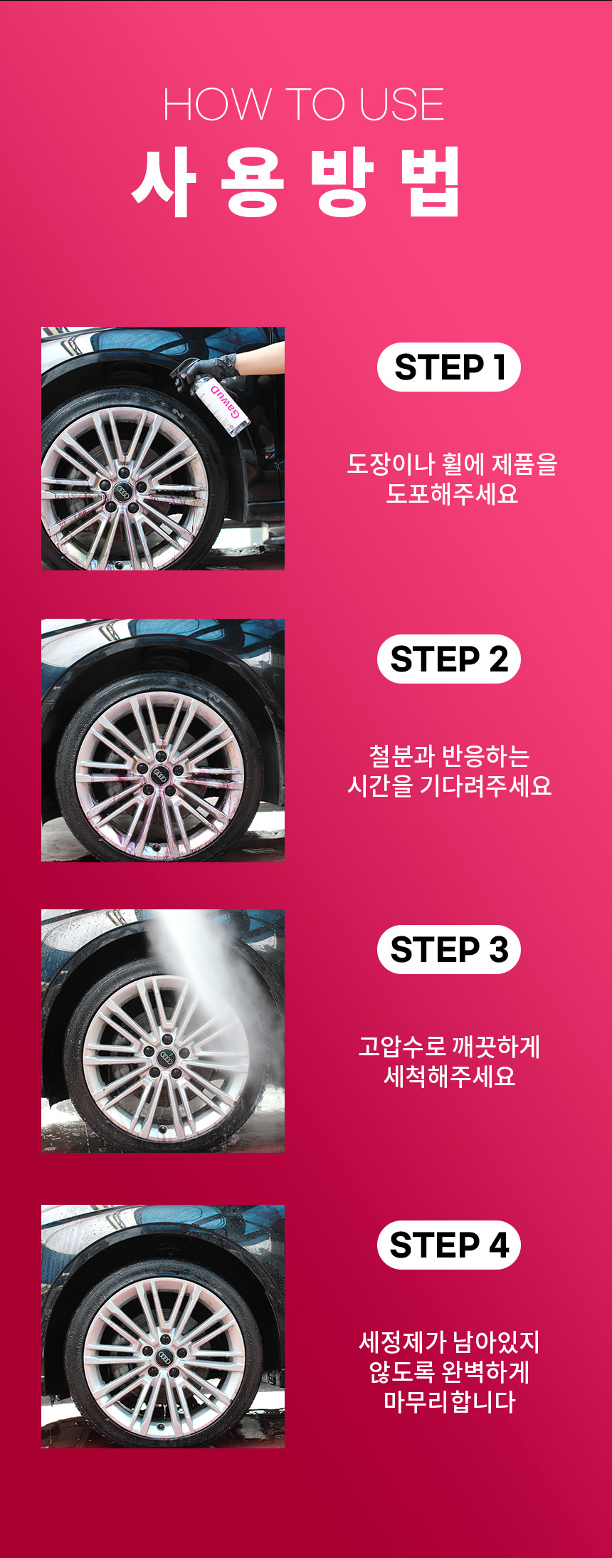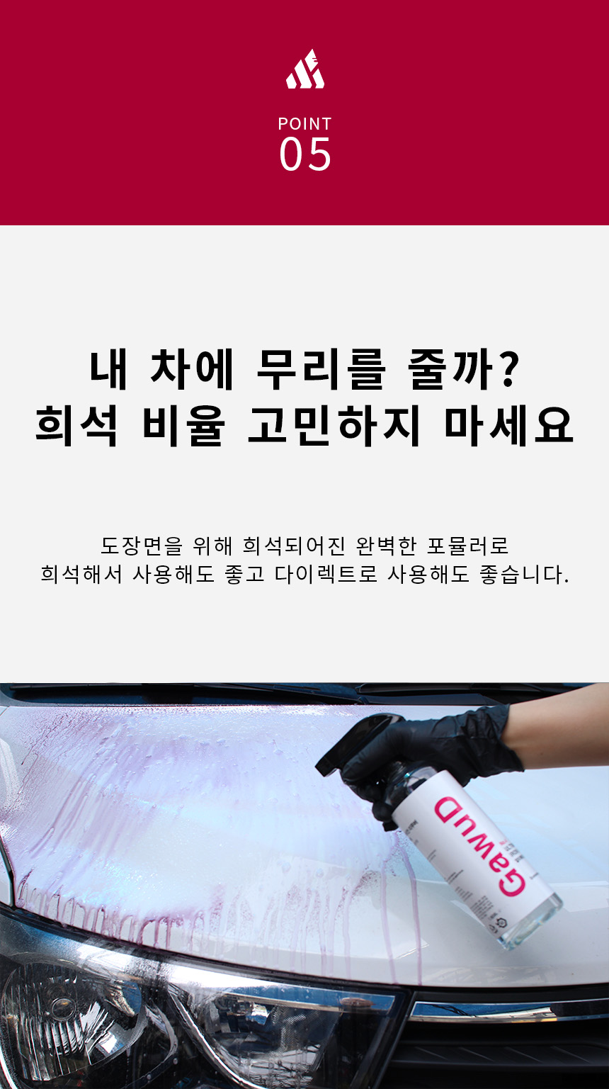 | 2. 용도(표백제의 경우 계열을 함께 표시) 및 제형 | 세정제 - 자동차용(외부용), 일반용(기타표면세정용(자전거용,오토바이용,선박용)), 제거제 - 자동차용(외부용), 일반용(기타제거용(녹제거용(자전거용,오토바이용,선박용)) / 분무기형, 보충형(분무기형) |
