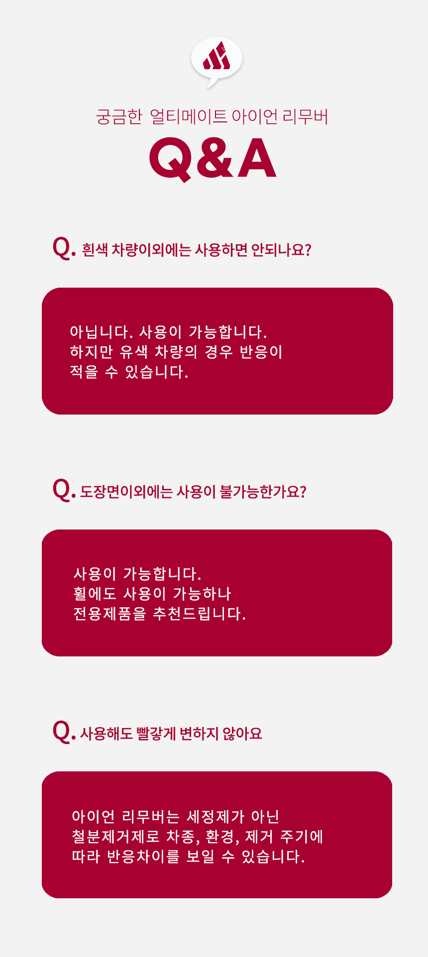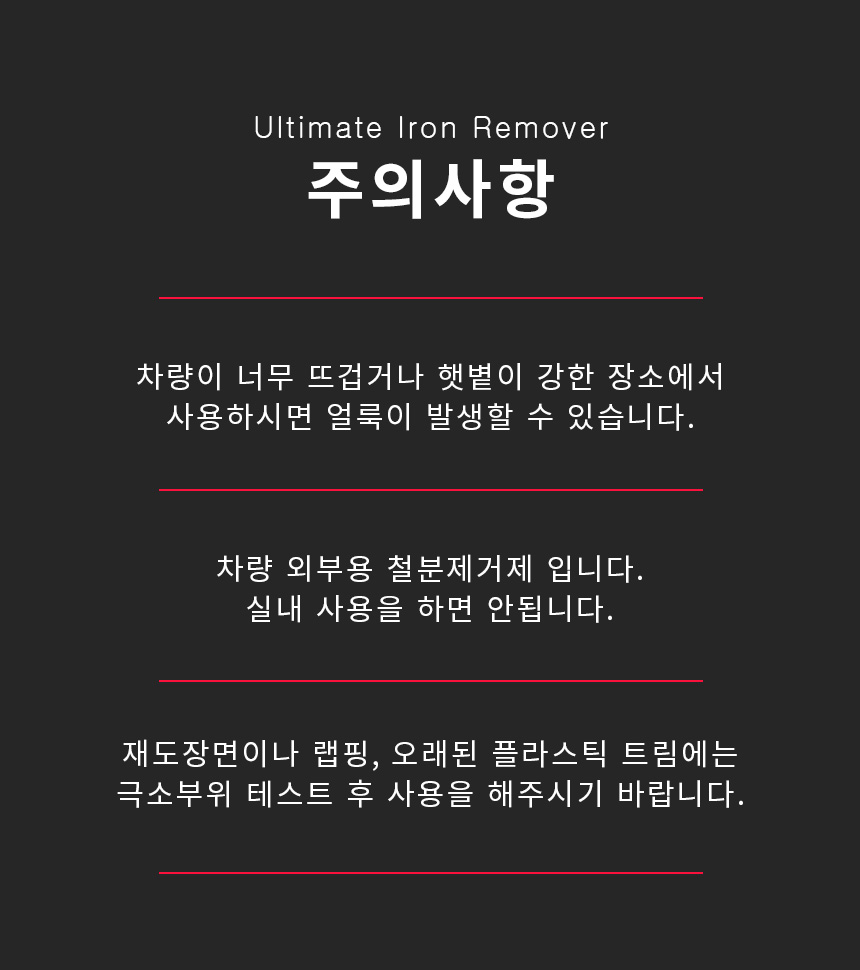 | 9. 사용상 주의사항 | 자동차실내에서는 사용하지 마시오 적용부위에 열을 완전히 식혀주시오 표시사항에 기재된 제품의 용도 외에는 사용하지 마시오 사람에게 직접 뿌리거나 분사되는 내용물을 흡입 또는 마시지 마시오 피부가 민감하거나 손상된 사람은 제품을 장기간 접촉하지 않도록 주의하시오 다른 제품과 섞어 사용할 경우 인체에 치명적인 손상을 입힐 수 있으니 섞어 사용하지 마시오 |