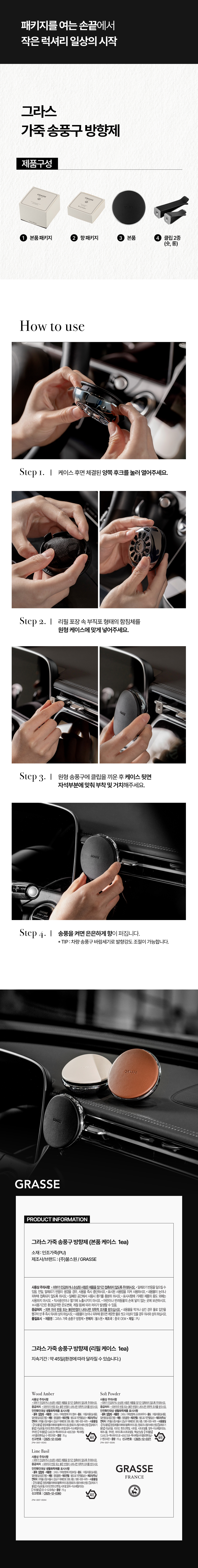 | 1. 품목 및 제품명 | • 품목 : 방향제 • 제품명 : 그라스 가죽방향제 우드엠버 소프트파우더 라임바질 |