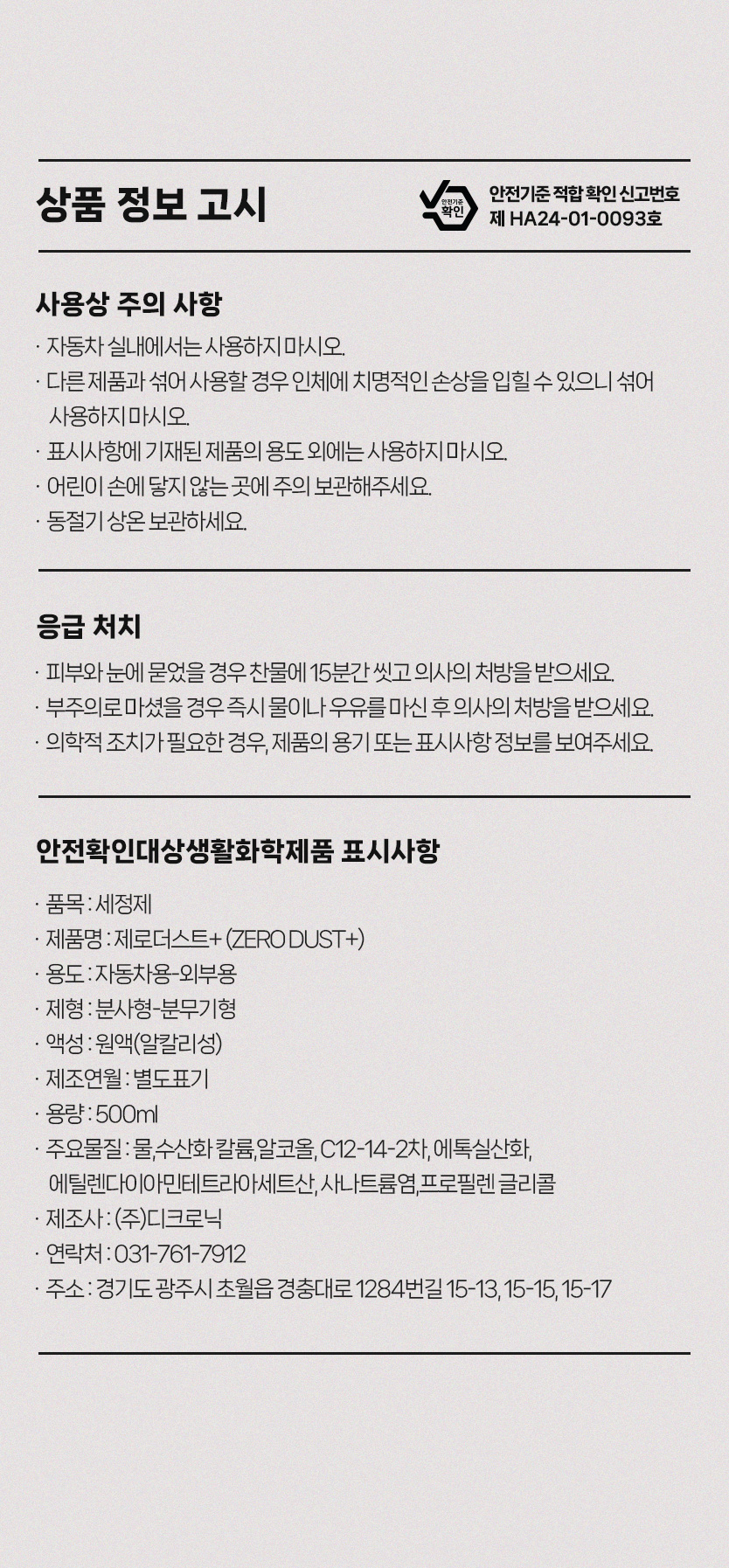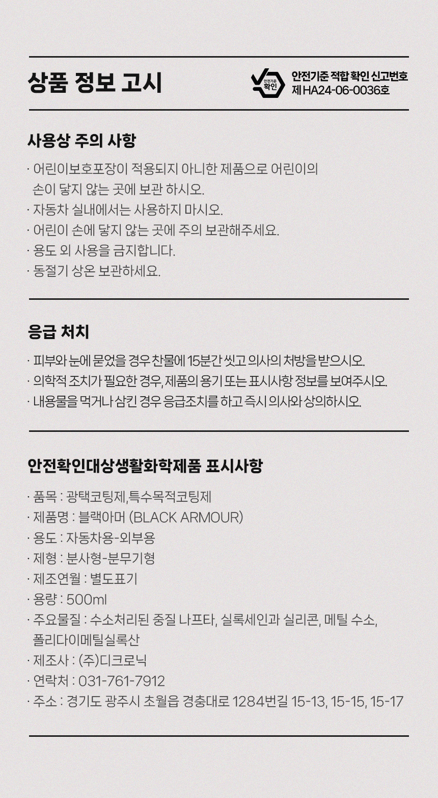 | 10. 안전기준 적합확인 신고번호(자가검사번호) 또는 안전확인대상 생활화학제품 승인번호 | HA24-06-0036 / HA24-01-0093 |