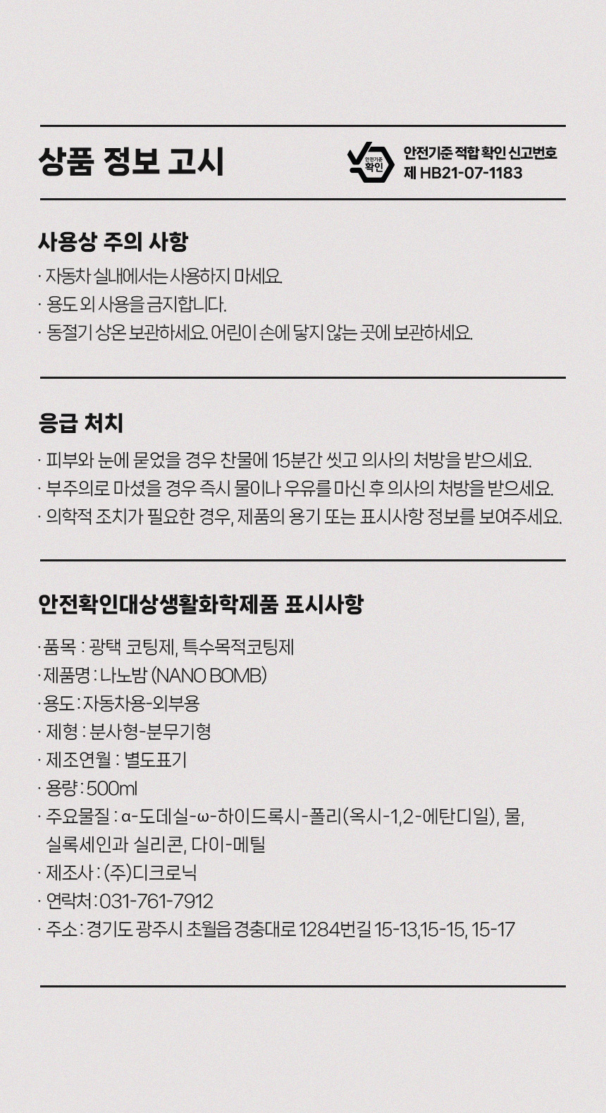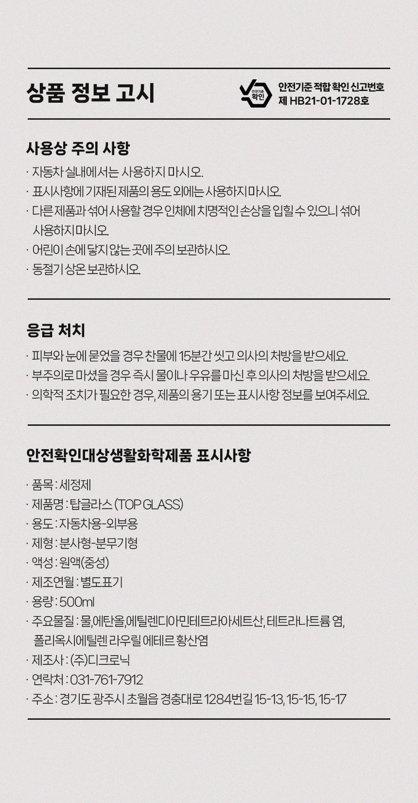 | 1. 품목 및 제품명 | 세정제 / 탑글라스 광택코팅제 / 나노밤 |