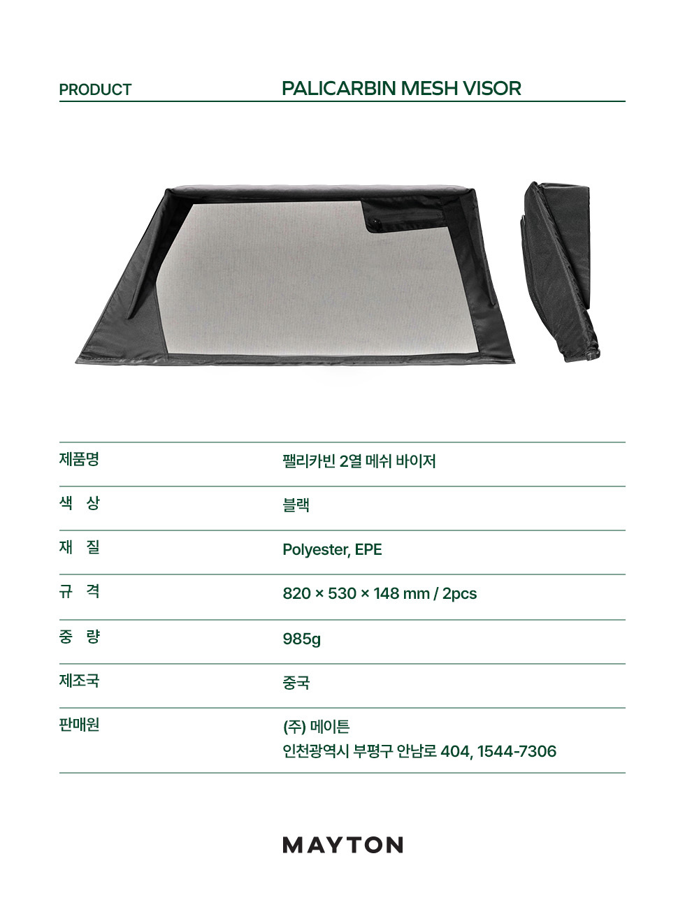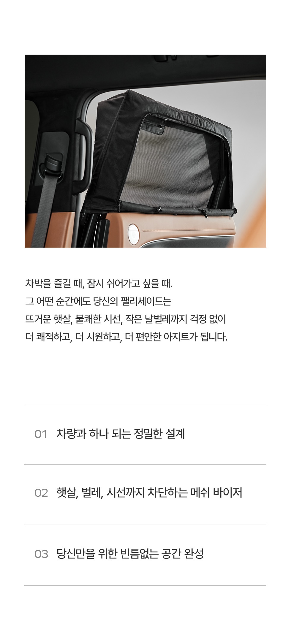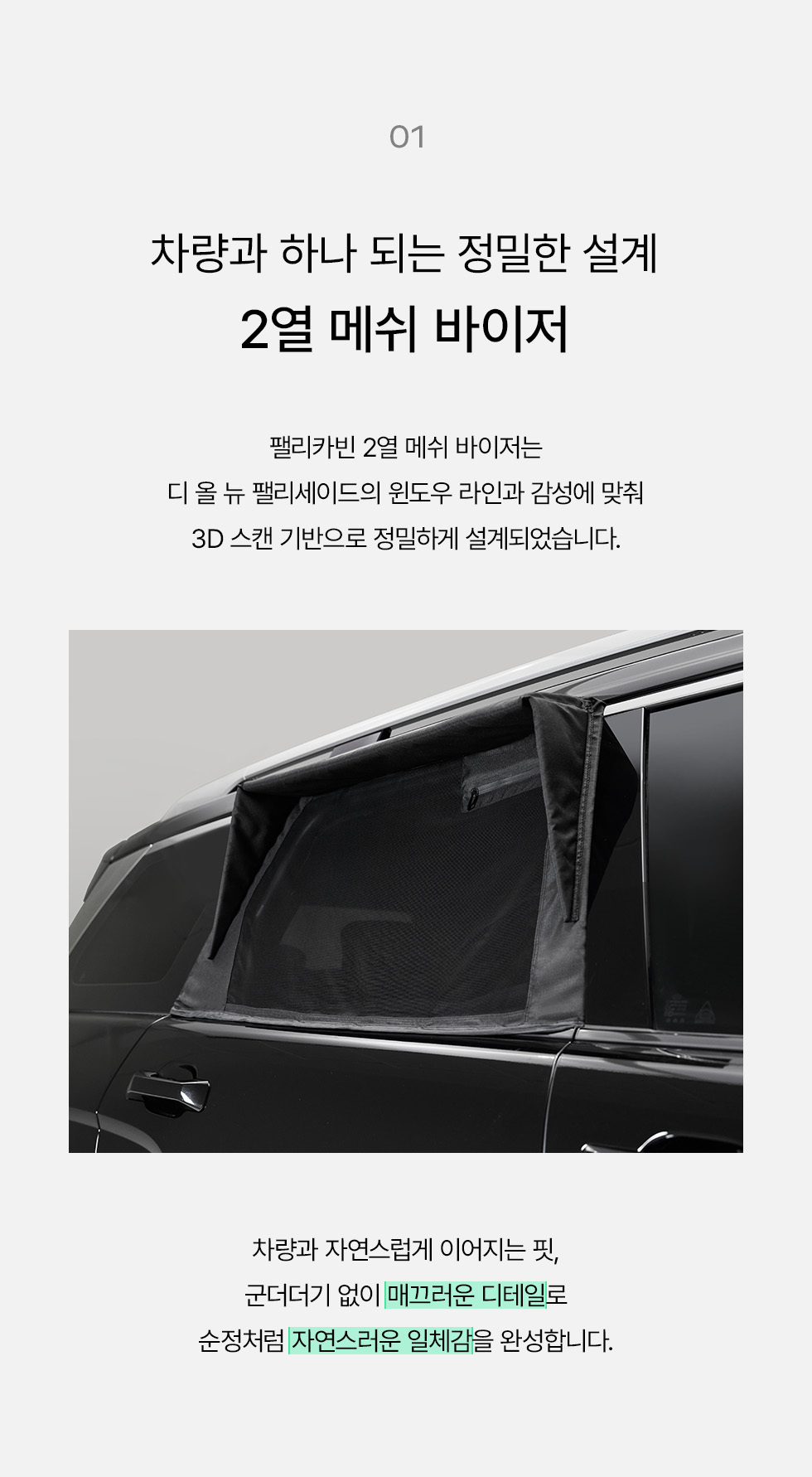| 1. 품명 및 모델명 | 팰리세이드 LX3 튜닝 용품 디올뉴 펠리세이드 전용 캠핑 모기장 2열 메쉬 바이저 2p |