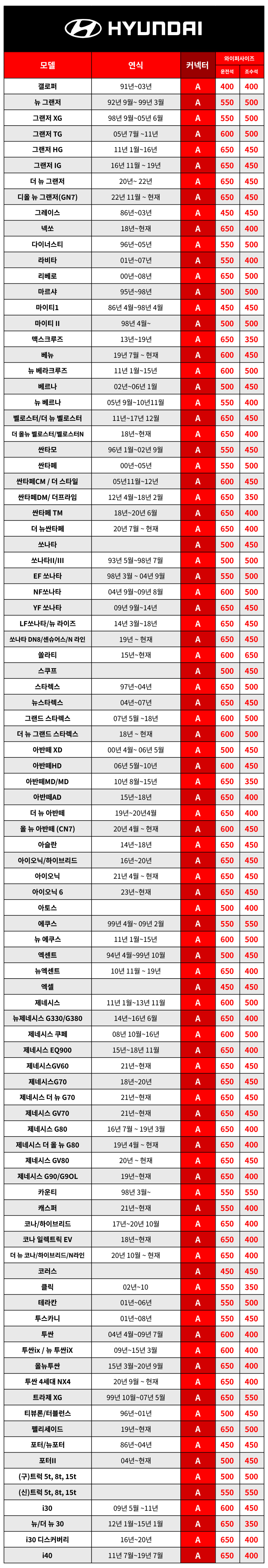| 7. 적용차종 | 갤로퍼, 싼타페, 제네시스, 프라이드, 에스페로 등 |