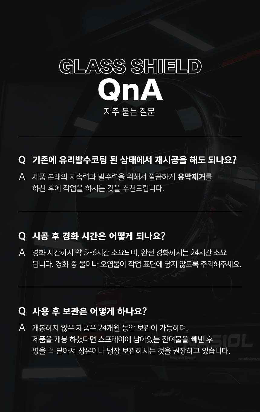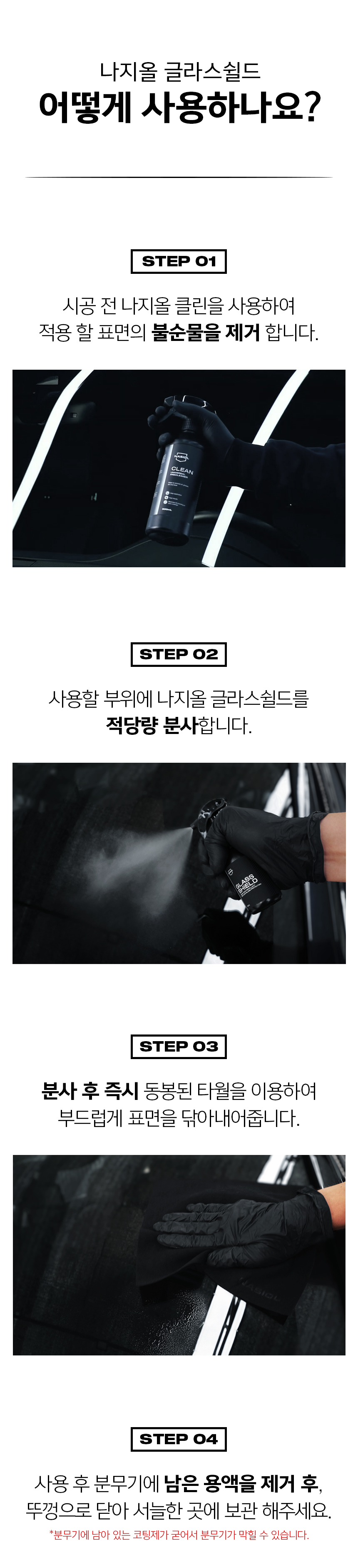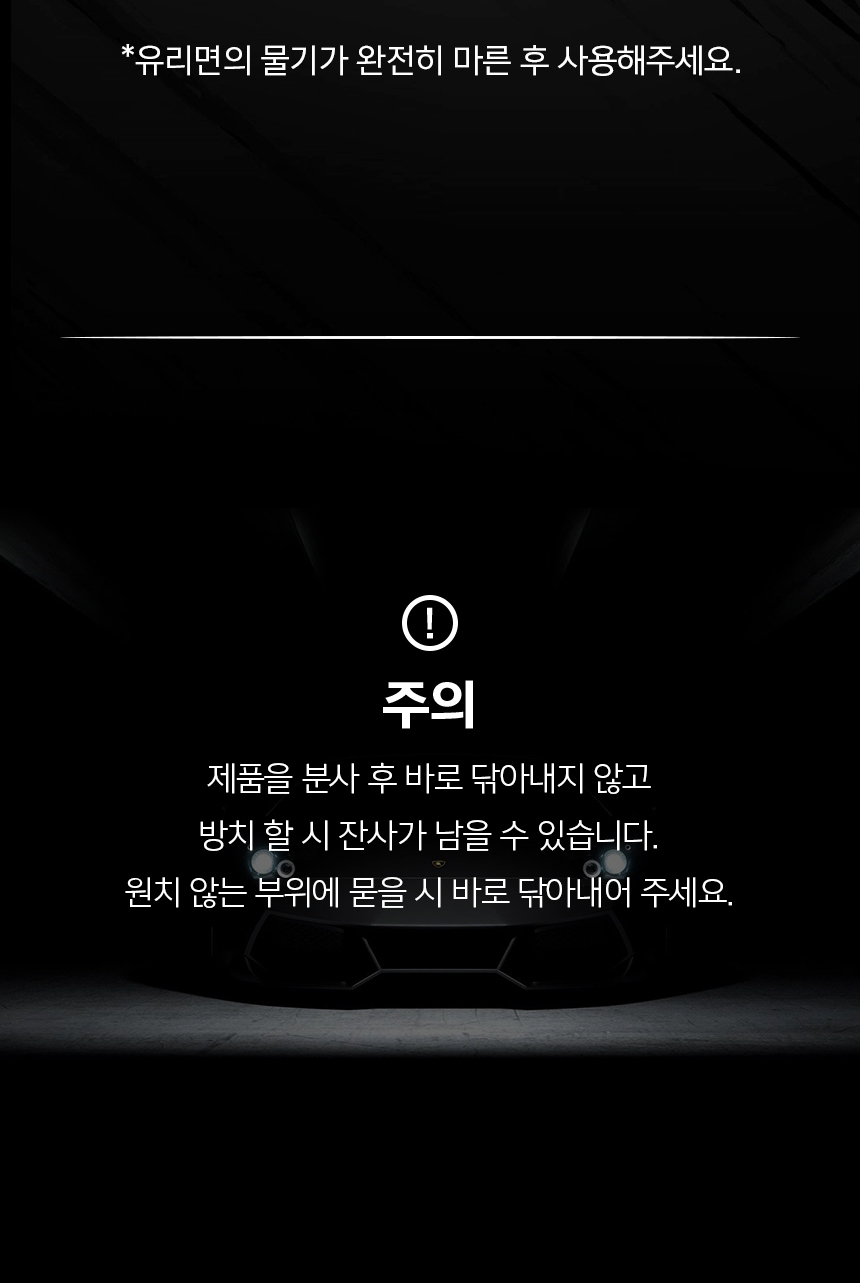 | 9. 사용상 주의사항 | -차량 유리 및 거울 등 유리제품 외 다른 표면에 사용하지 마세요. 만일 다른 표면에 사용하였을 경우 마른 극세사 천으로 빨리 닦아주세요. -자동차 실내에서는 사용하지 마시오. |