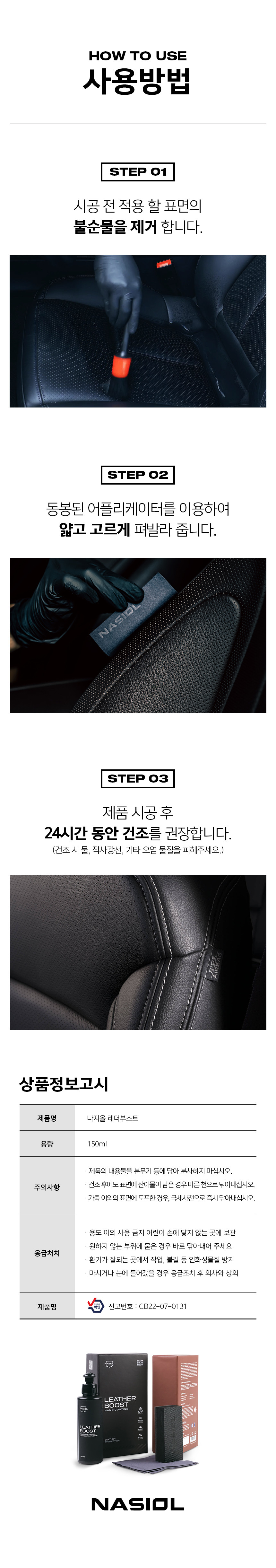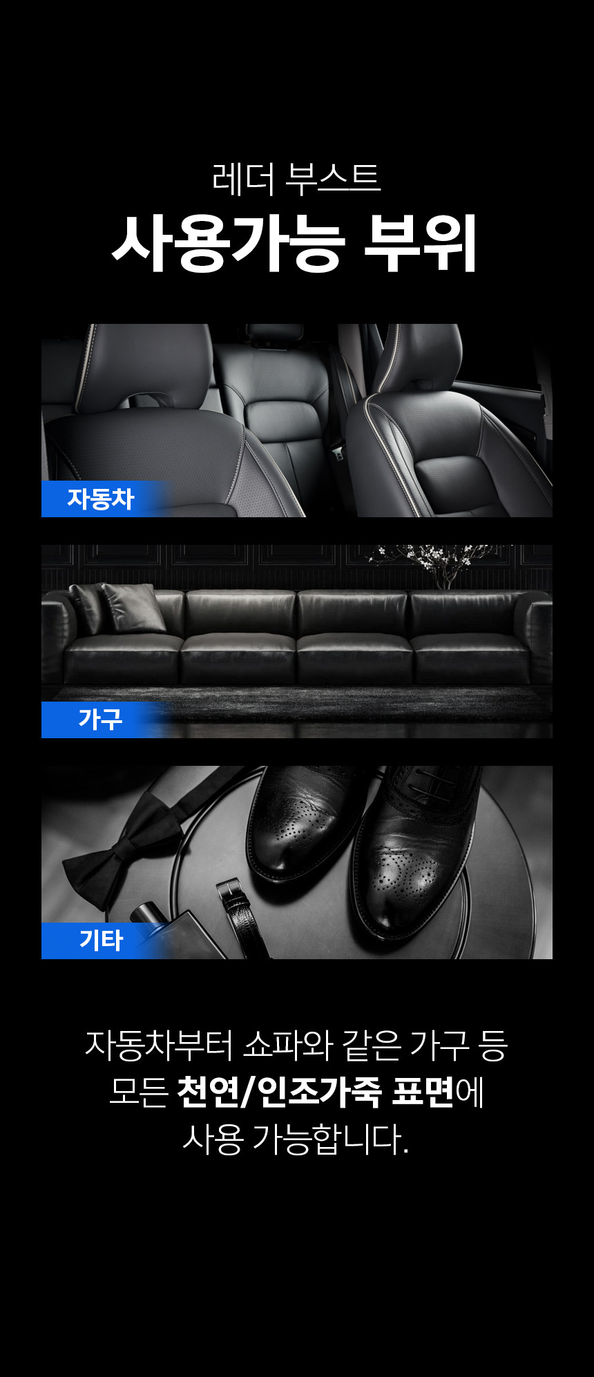 | 9. 사용상 주의사항 | -제품의 내용물을 분무기 등에 담아 분사하지 마시오. -건조 후에도 표면에 잔여물이 남아 있을 경우 마른 천으로 닦아내십시오 -가죽 이외의 표면에 도포한 경우에는 극세사 천으로 즉시 닦아내십시오 |