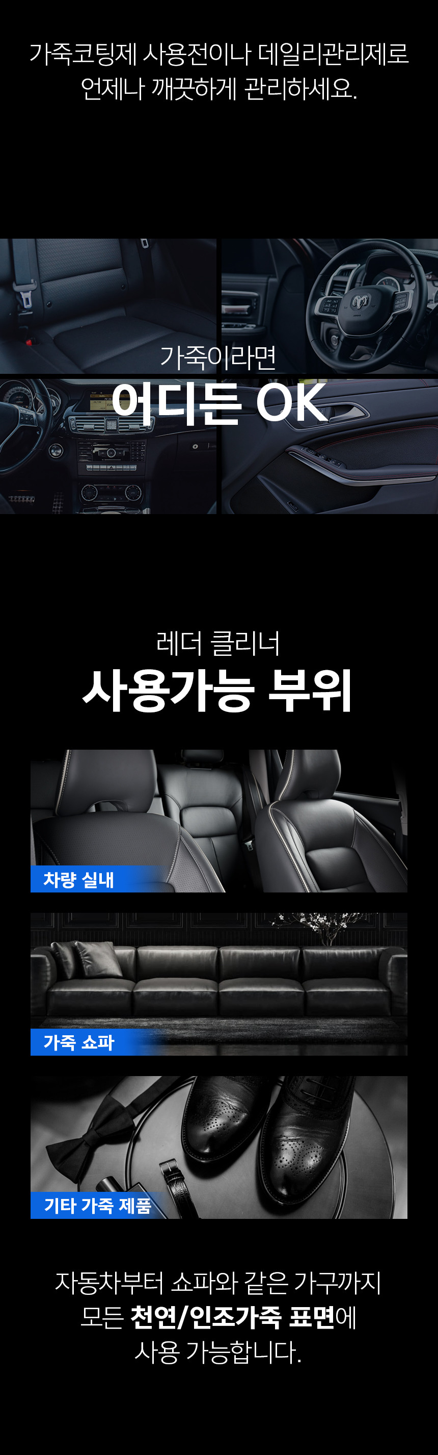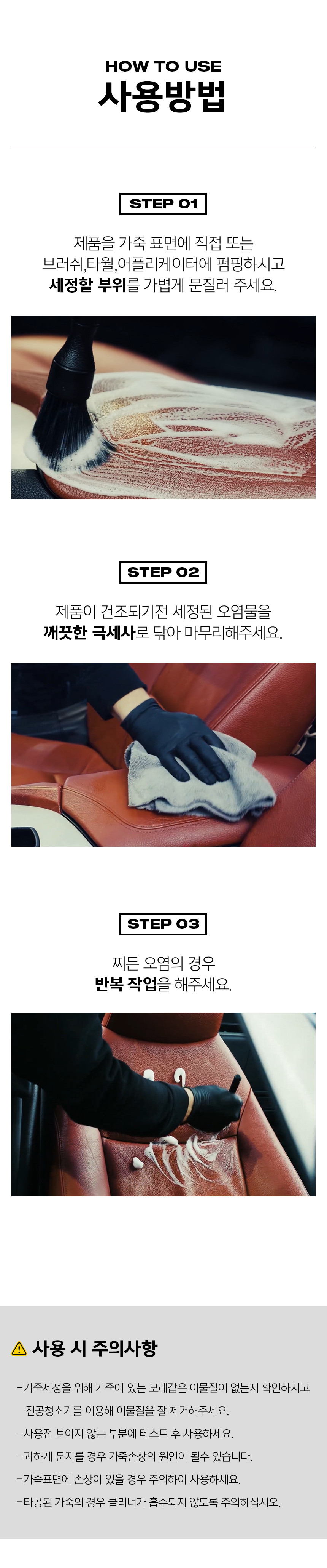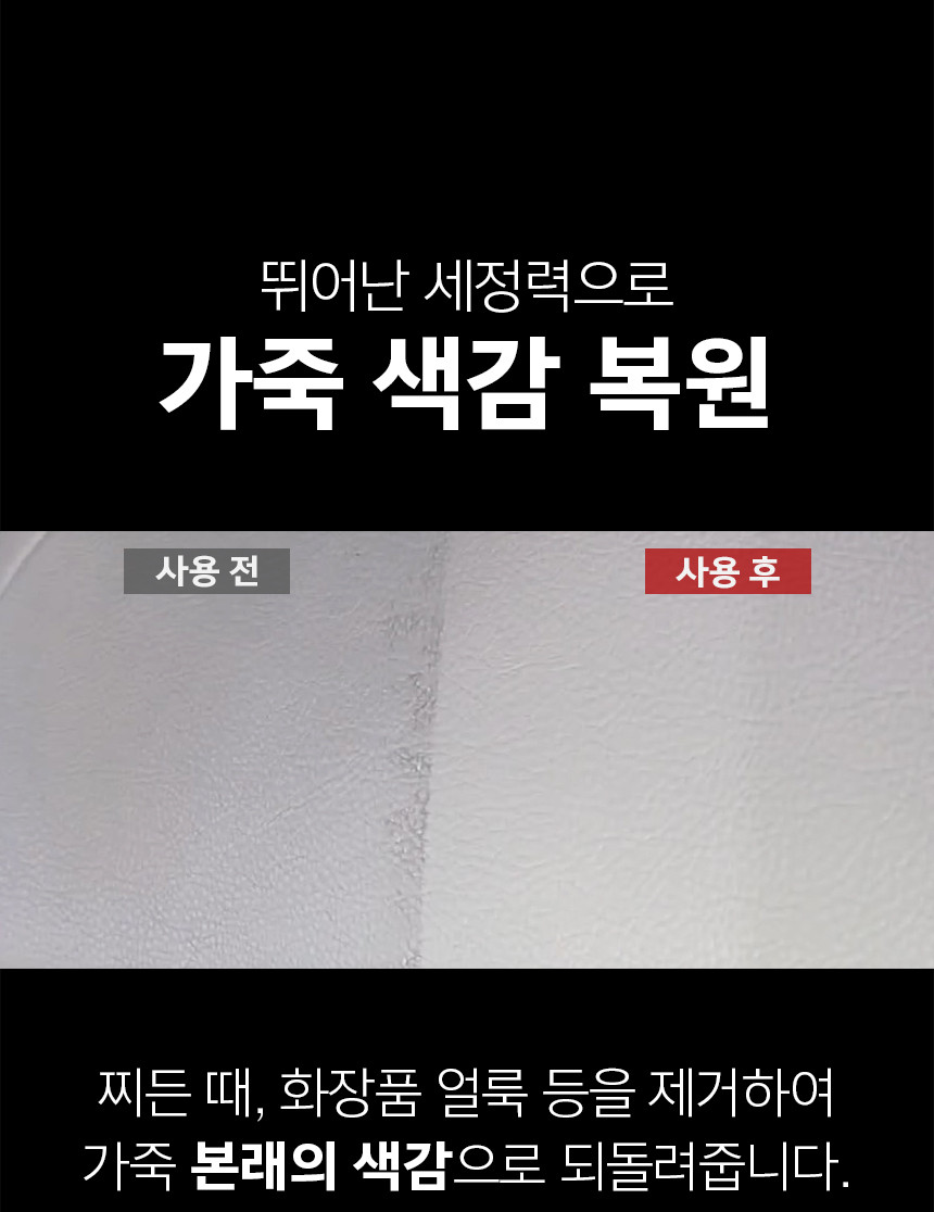 | 9. 사용상 주의사항 | - 표시사항에 기재된 제품의 용도 외에는 사용하지 마시오 - 다른 제품과 섞어 사용할 경우 인체에 치명적인 손상을 입힐 수 있으니 섞어 사용하지 마시오 - 건조 후에도 표면에 잔여물이 남아 있을 경우 마른 천으로 닦아내십시오. - 가죽 이외의 표면에 도포한 경우에는 극세사 천으로 즉시 닦아내십시오. |