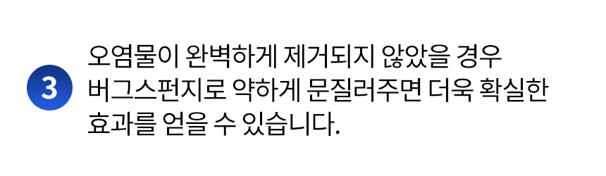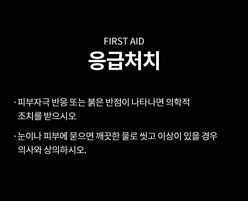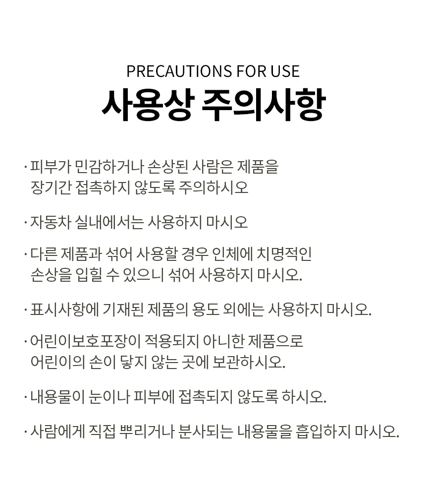 | 9. 사용상 주의사항 | 피부가 민감하거나 손상된 사람은 제품을 장기간 접촉하지 않도록 주의하시오 자동차 실내에서는 사용하지 마시오 다른 제품과 섞어 사용할 경우 인체에 치명적인 손상을 입힐 수 있으니 섞어 사용하지 마시오. 표시사항에 기재된 제품의 용도 외에는 사용하지 마시오. 어린이보호포장이 적용되지 아니한 제품으로 어린이의 손이 닿지 않는 곳에 보관하시오. 내용물이 눈이나 피부에 접촉되지 않도록 하시오. 사람에게 직접 뿌리거나 분사되는 내용물을 흡입하지 마시오. |