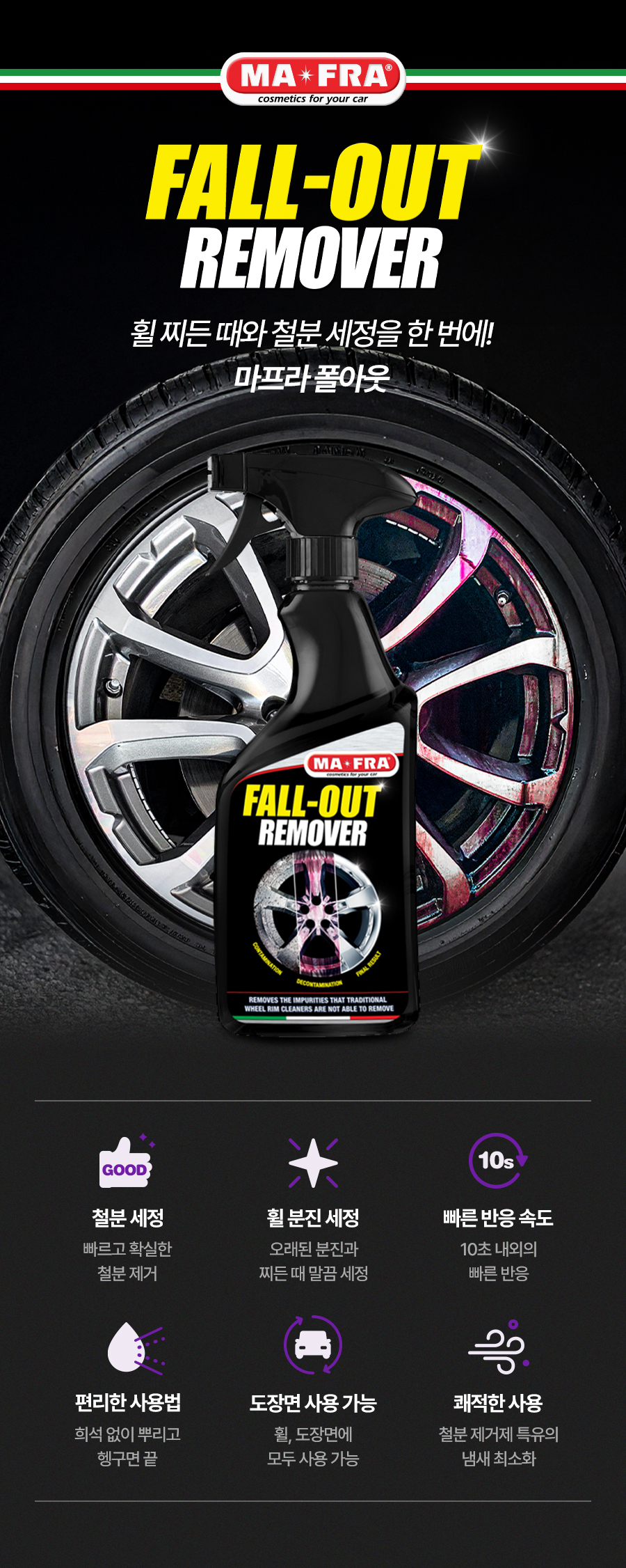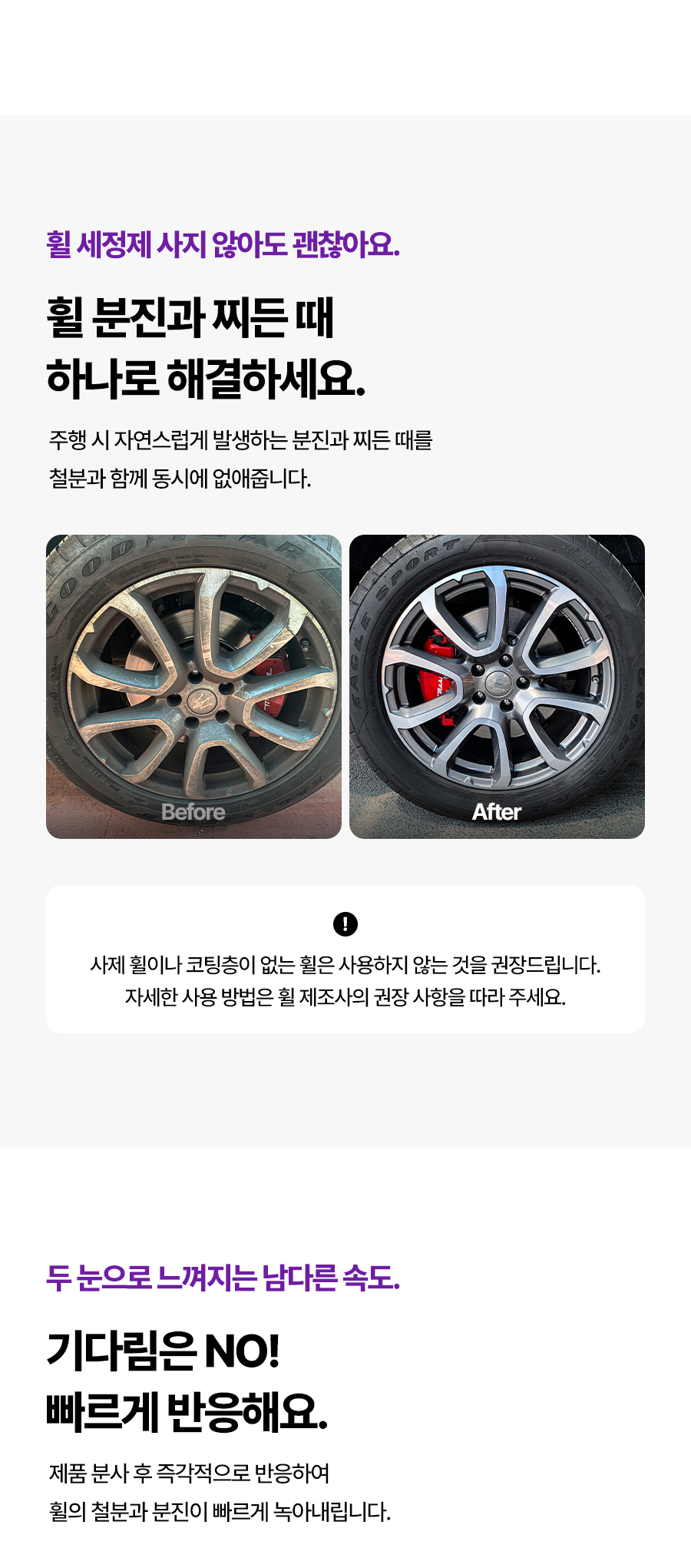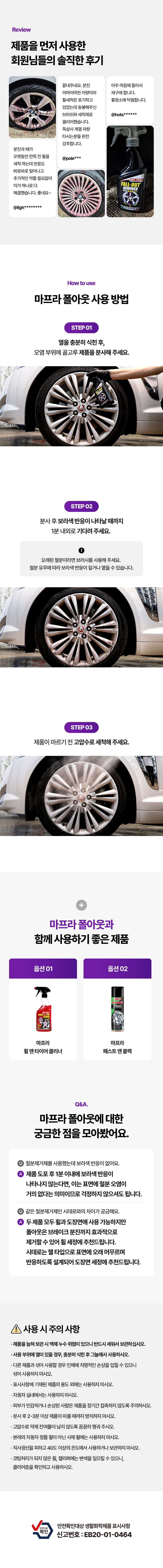 | 9. 사용상 주의사항 | 다른 제품과 섞어 사용할 경우 인체에 치명적인 손상을 입힐 수 있으니 섞어 사용하지 마시오. 표시사항에 기재된 제품의 용도 외에는 사용하지 마시오. 자동차 실내에서는 사용하지 마시오. 피부가 민감하거나 손상된 사람은 제품을 장기간 접촉하지 않도록 주의하시오. 휠이 뜨거울 때는 절대 도포하지 마시오. 분사 후 2~3 분 이상 제품 마를 때까지 방치하지 마시오. 고압수로 약제 잔여물이 남지 않도록 꼼꼼히 헹궈 주시오. 본래의 자동차 정품 휠이 아닌 사제 휠에는 사용하지 마시오. 직사광선을 피하고 40 도 이상의 온도에서 사용하거나 보관하지 마시오. 코팅처리가 되지 않은 휠, 캘리퍼에는 변색을 일으킬 수 있으니, 클리어층을 확인하고 사용하시오. |