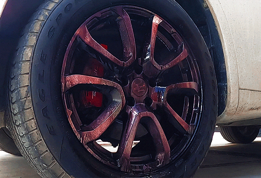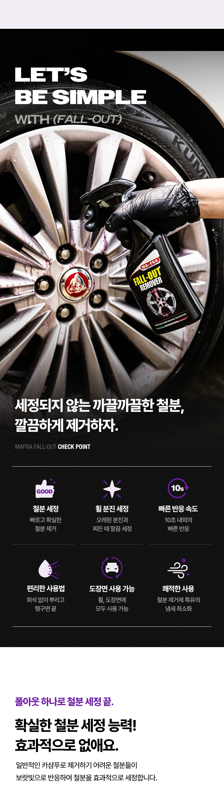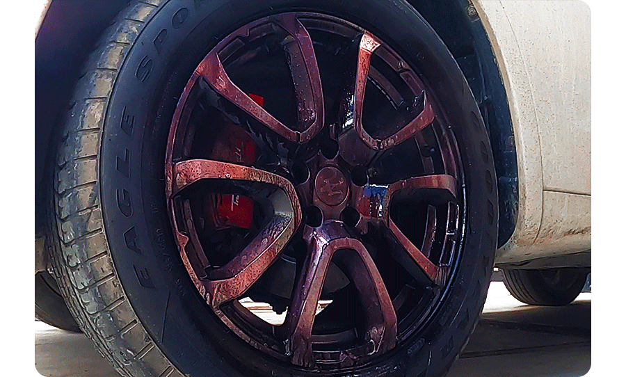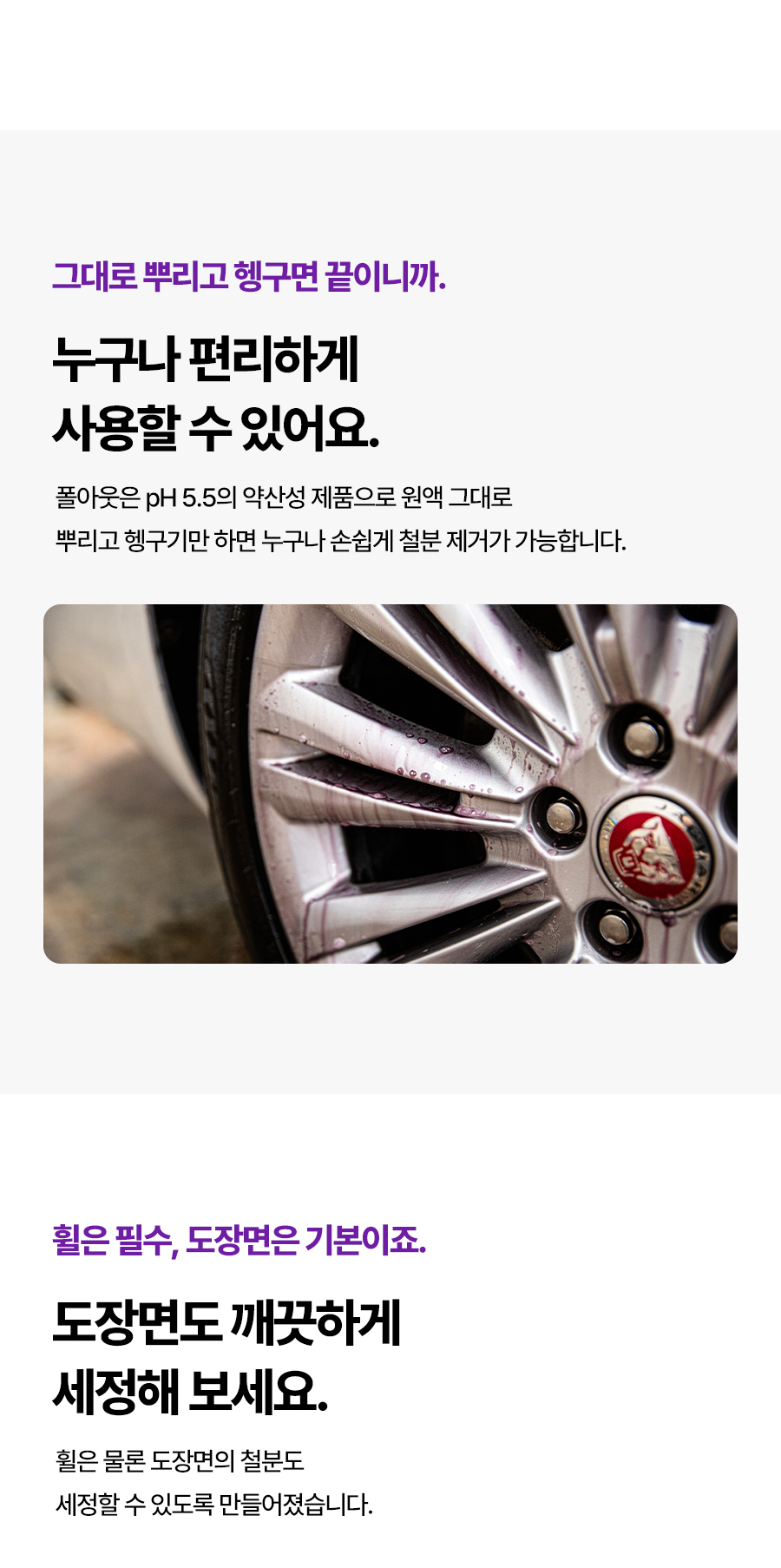 | 9. 사용상 주의사항 | 다른 제품과 섞어 사용할 경우 인체에 치명적인 손상을 입힐 수 있으니 섞어 사용하지 마시오. 표시사항에 기재된 제품의 용도 외에는 사용하지 마시오. 자동차 실내에서는 사용하지 마시오. 피부가 민감하거나 손상된 사람은 제품을 장기간 접촉하지 않도록 주의하시오. 휠이 뜨거울 때는 절대 도포하지 마시오. 분사 후 2~3 분 이상 제품 마를 때까지 방치하지 마시오. 고압수로 약제 잔여물이 남지 않도록 꼼꼼히 헹궈 주시오. 본래의 자동차 정품 휠이 아닌 사제 휠에는 사용하지 마시오. 직사광선을 피하고 40 도 이상의 온도에서 사용하거나 보관하지 마시오. 코팅처리가 되지 않은 휠, 캘리퍼에는 변색을 일으킬 수 있으니, 클리어층을 확인하고 사용하시오. |