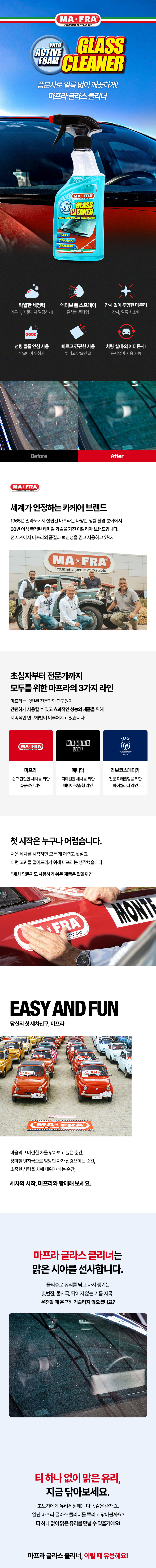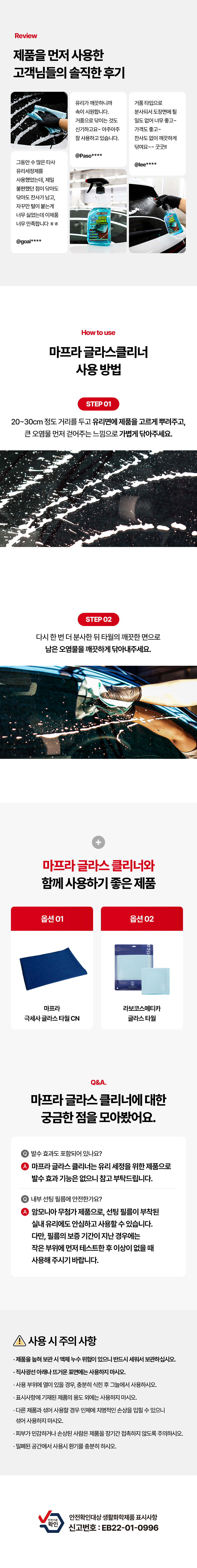 | 1. 품목 및 제품명 | 마프라 글라스 클리너 2.0 세정제품 > 세정제 > 자동차용 (실내용) 세정제품 > 세정제 > 자동차용 (외부용) 세정제품 > 제거제 > 자동차용 (실내용) 세정제품 > 제거제 > 자동차용 (외부용 (먼지,기름때)) |