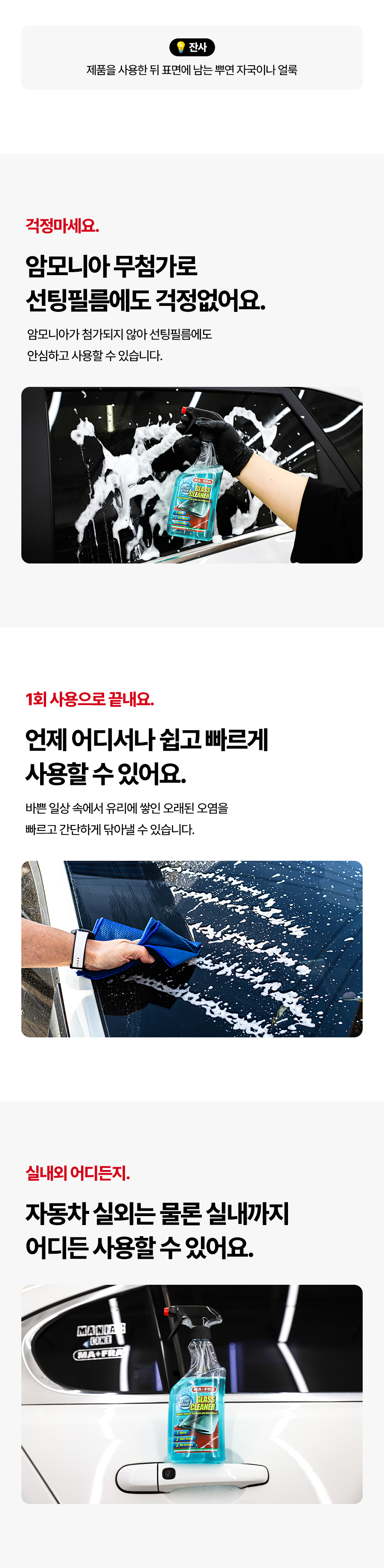 | 2. 용도(표백제의 경우 계열을 함께 표시) 및 제형 | 세정제품 > 세정제 > 자동차용 (실내용) 세정제품 > 세정제 > 자동차용 (외부용) 세정제품 > 제거제 > 자동차용 (실내용) 세정제품 > 제거제 > 자동차용 (외부용 (먼지,기름때)) 분무기형 |