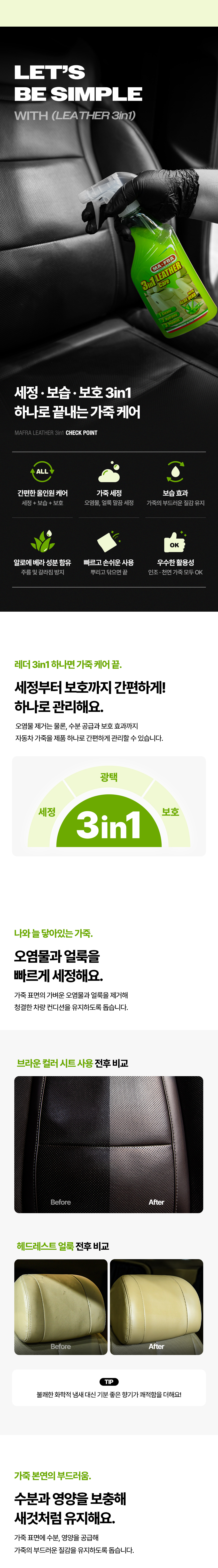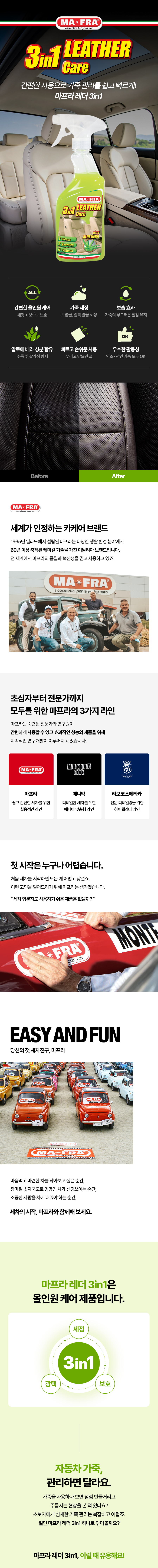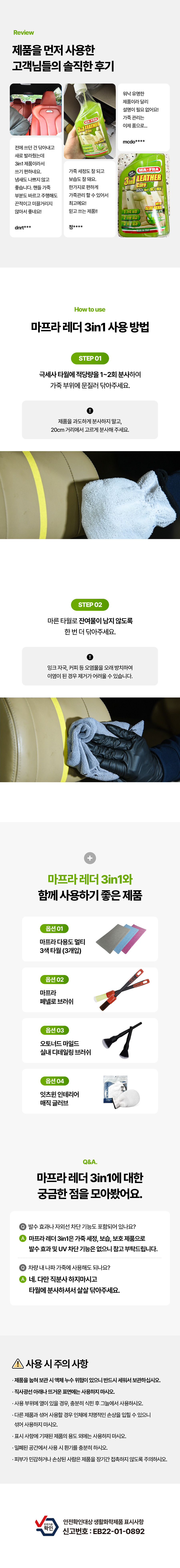 | 1. 품목 및 제품명 | 마프라 레더 3인1 세정제품 > 세정제 > 자동차용 (실내용) 세정제품 > 제거제 > 자동차용 (실내용) 코팅제품 > 광택코팅제 > 자동차용 (실내용) 코팅제품 > 특수목적코팅제 > 자동차용 (실내용) |