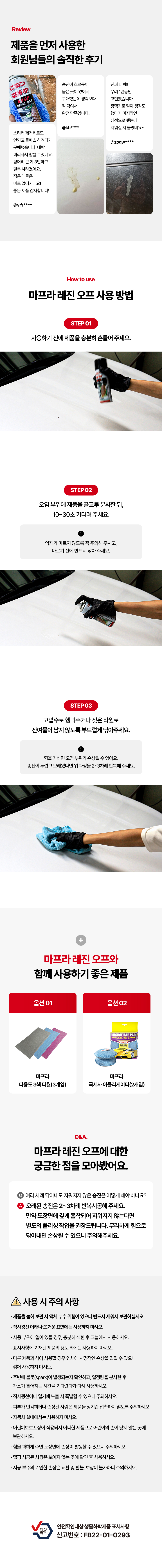 | 10. 안전기준 적합확인 신고번호(자가검사번호) 또는 안전확인대상 생활화학제품 승인번호 | FB22-01-0293 |