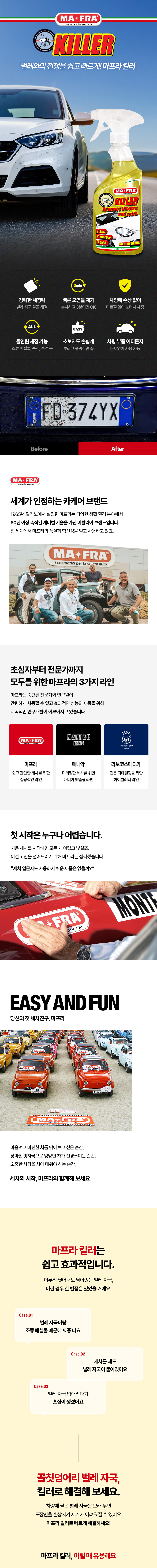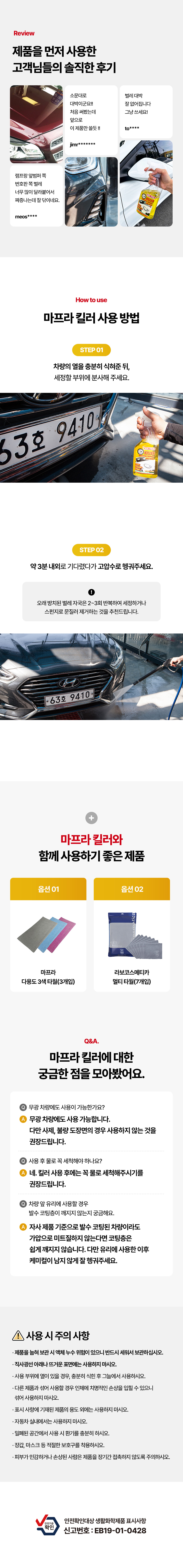 | 1. 품목 및 제품명 | 마프라 킬러 듀얼 세정제품 > 세정제 > 자동차용 (외부용) 세정제품 > 제거제 > 자동차용 (외부용 (벌레사체,송진,수액제거용)) |