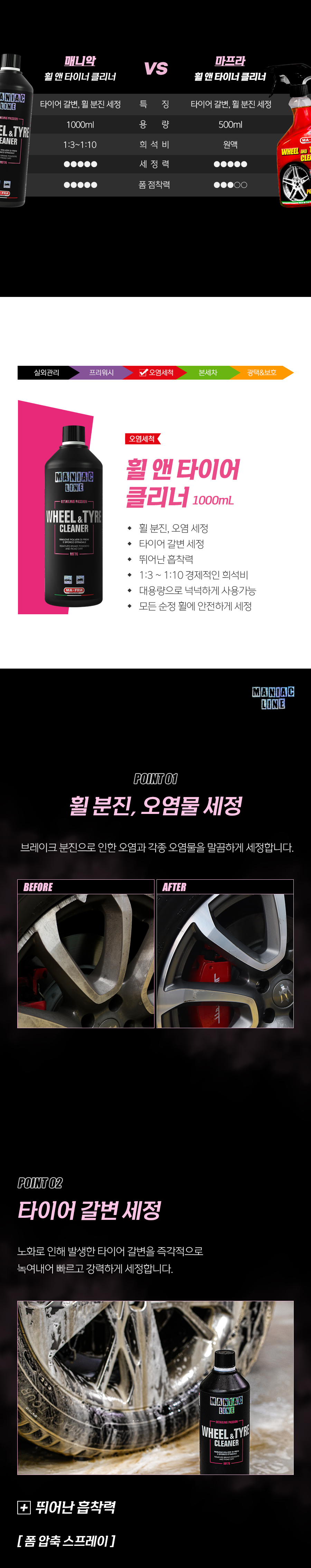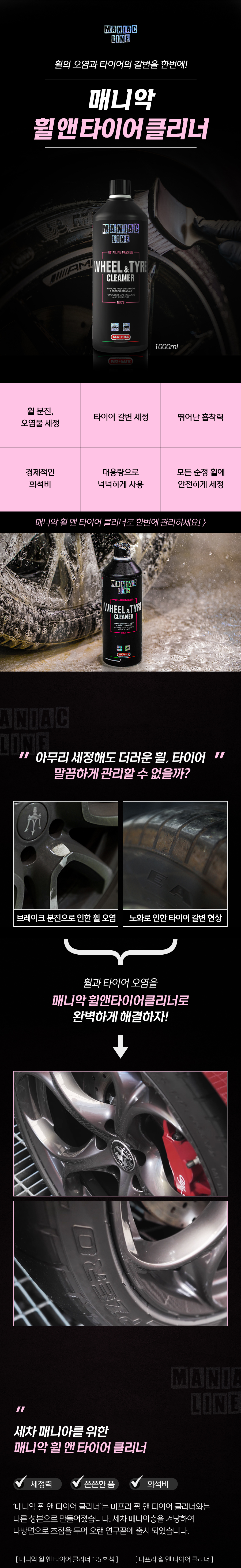 | 1. 품목 및 제품명 | 매니악 휠앤타이어 클리너 세정제품 > 세정제 > 자동차용 (외부용) 세정제품 > 제거제 > 자동차용 (외부용 (분진,갈변제거용)) |
