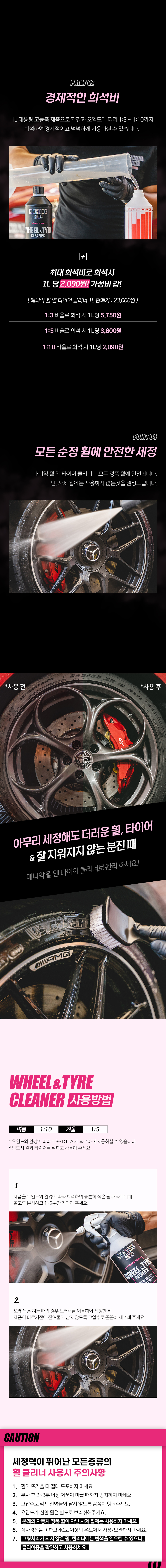 | 9. 사용상 주의사항 | 어린이 손에 닿지 않는 곳에 보관하시오 용기와 결합된 뚜껑을 억지로 벗기지 마시오 다른 제품과 섞어 사용할 경우 인체에 치명적인 손상을 입힐 수 있으니 섞어 사용하지 마시오. 표시사항에 기재된 제품의 용도 외에는 사용하지 마시오. 자동차 실내에서는 사용하지 마시오. 피부가 민감하거나 손상된 사람은 제품을 장기간 접촉하지 않도록 주의하시오. 휠이 뜨거울 때는 절대 도포하지 마시오. 분사 후 2~3분 이상 제품 마를 때까지 방치하지 마시오. 고압수로 약제 잔여물이 남지 않도록 꼼꼼히 헹궈 주시오. 본래의 자동차 정품 휠이 아닌 사제 휠에는 사용하지 마시오. 직사광선을 피하고 40도 이상의 온도에서 사용하거나 보관하지 마시오. 코팅처리가 되지 않은 휠, 캘리퍼에는 변색을 일으킬 수 있으니, 클리어층을 확인하고 사용하시오 |