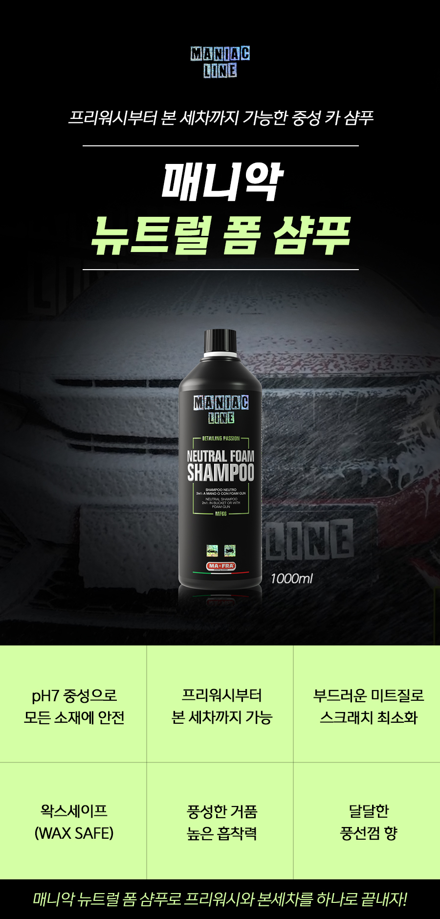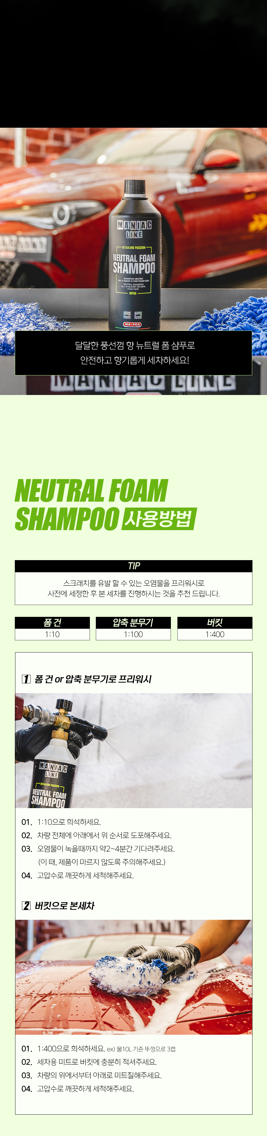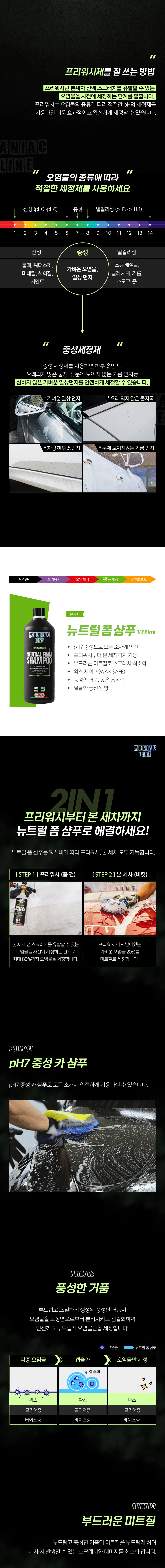 | 1. 품목 및 제품명 | 매니악 뉴트럴 폼 샴푸 세정제품 > 세정제 > 자동차용 (외부용) 세정제품 > 제거제 > 자동차용 (외부용 (물자국,묵은 때, 기타오염물)) |