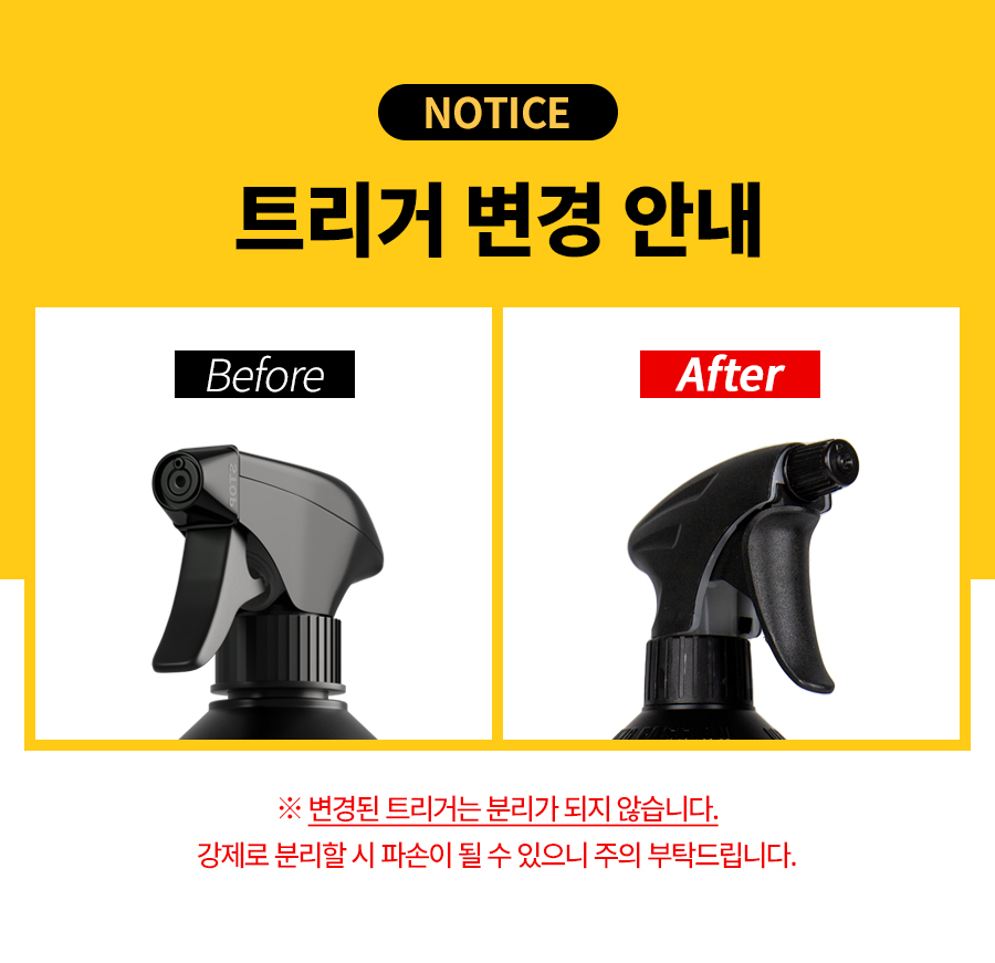 | 9. 사용상 주의사항 | 다른 제품과 섞어 사용할 경우 인체에 치명적인 손상을 입힐 수 있으니 섞어 사용하지 마시오. 표시사항에 기재된 제품의 용도 외에는 사용하지 마시오. 자동차 실내에서는 사용하지 마시오. 피부가 민감하거나 손상된 사람은 제품을 장기간 접촉하지 않도록 주의하시오. 시공 부위에 열이 있거나 직사광선에서 시공 하지 마십시오. 시공 중 제품이 마르지 않도록 주의하시오. 얼룩이 생겼다면 다시 한번 분사하여 닦아내시오. |