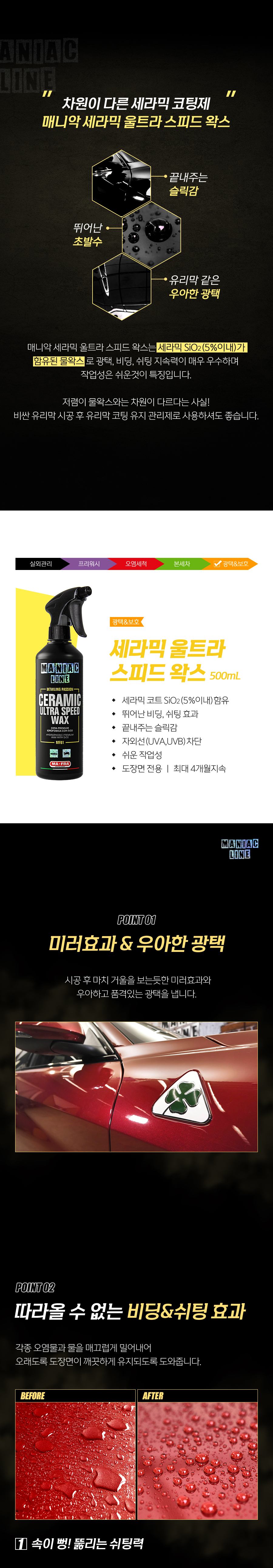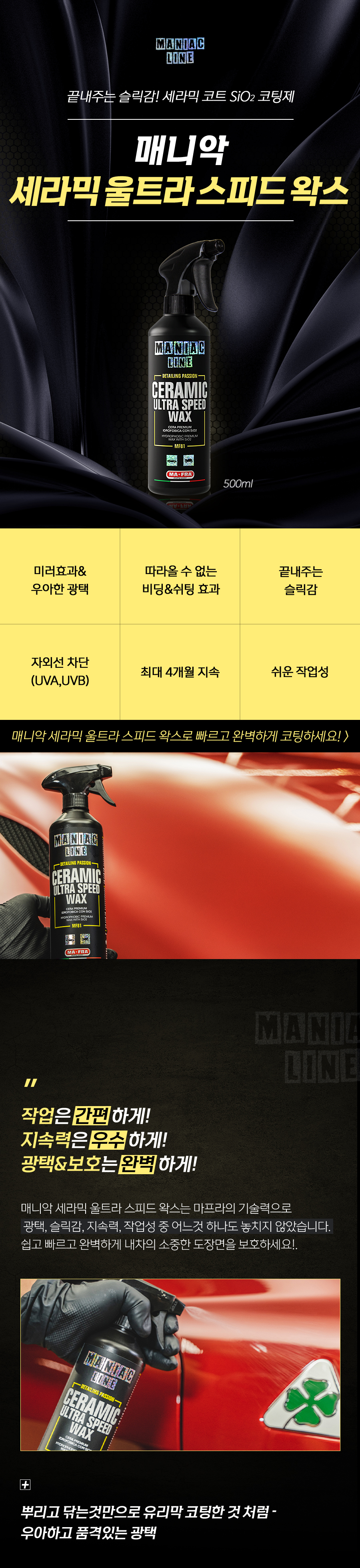 | 1. 품목 및 제품명 | 매니악 세라믹 울트라 스피드 왁스 코팅제품 > 광택코팅제 > 자동차용 (외부용) 코팅제품 > 특수목적코팅제 > 자동차용 (외부용) |
