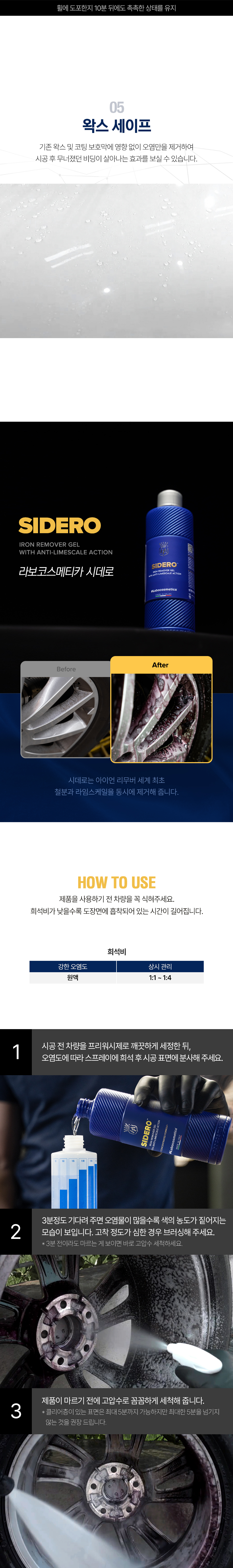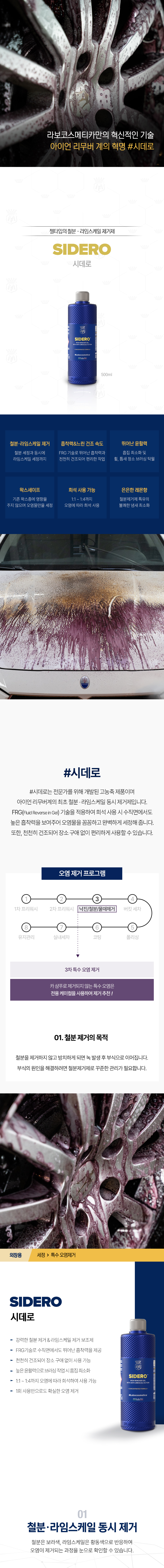| 1. 품목 및 제품명 | 라보코스메티카 시데로 세정제품 > 세정제 > 자동차용 (외부용) 세정제품 > 제거제 > 일반용 (기타제거용 (녹제거용)) 세정제품 > 제거제 > 자동차용 (외부용 (철분,미네랄,녹,분진제거용)) |