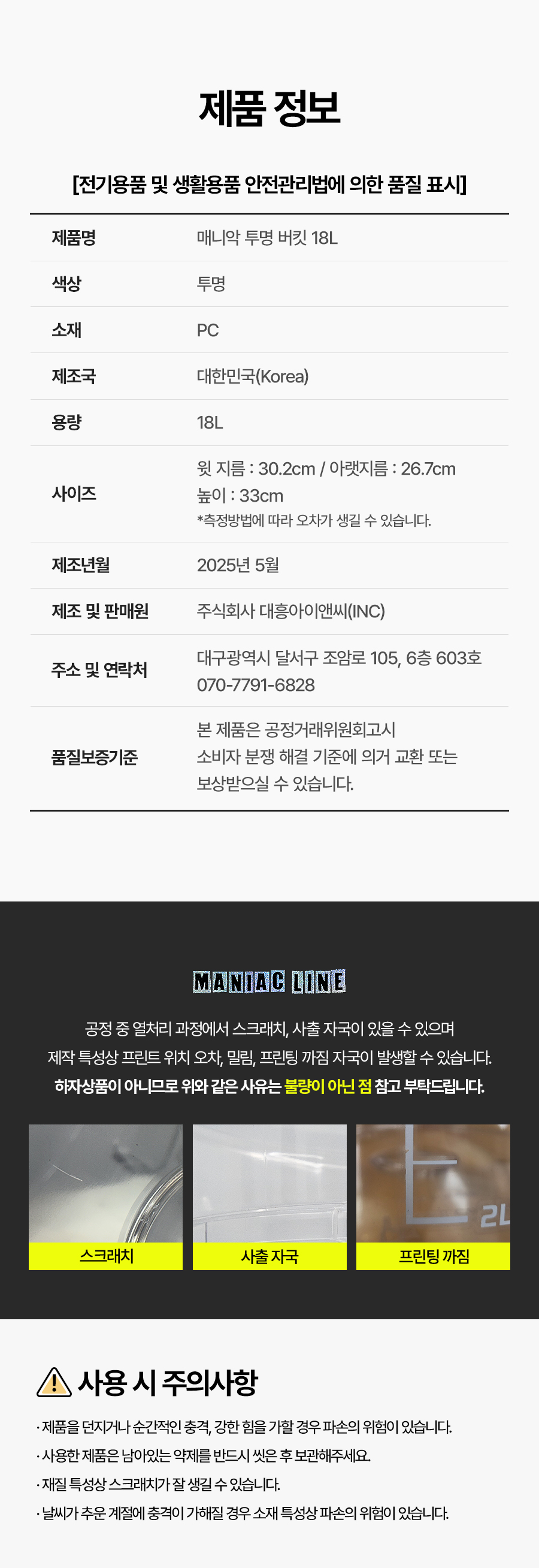 | 1. 품명 및 모델명 | 매니악 투명 버킷 18L |