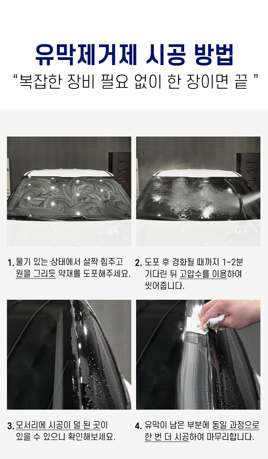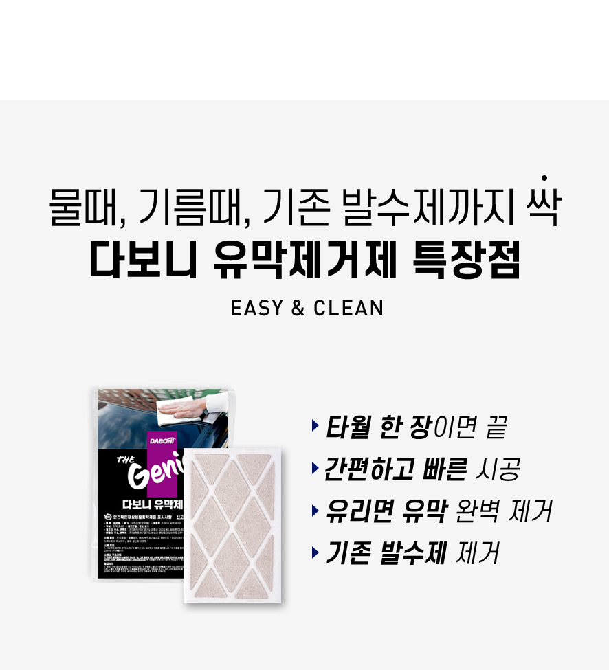 | 4. 중량·용량·매수 | 유막제거제(20ml 1매),발수코팅제(20ml 1매) |