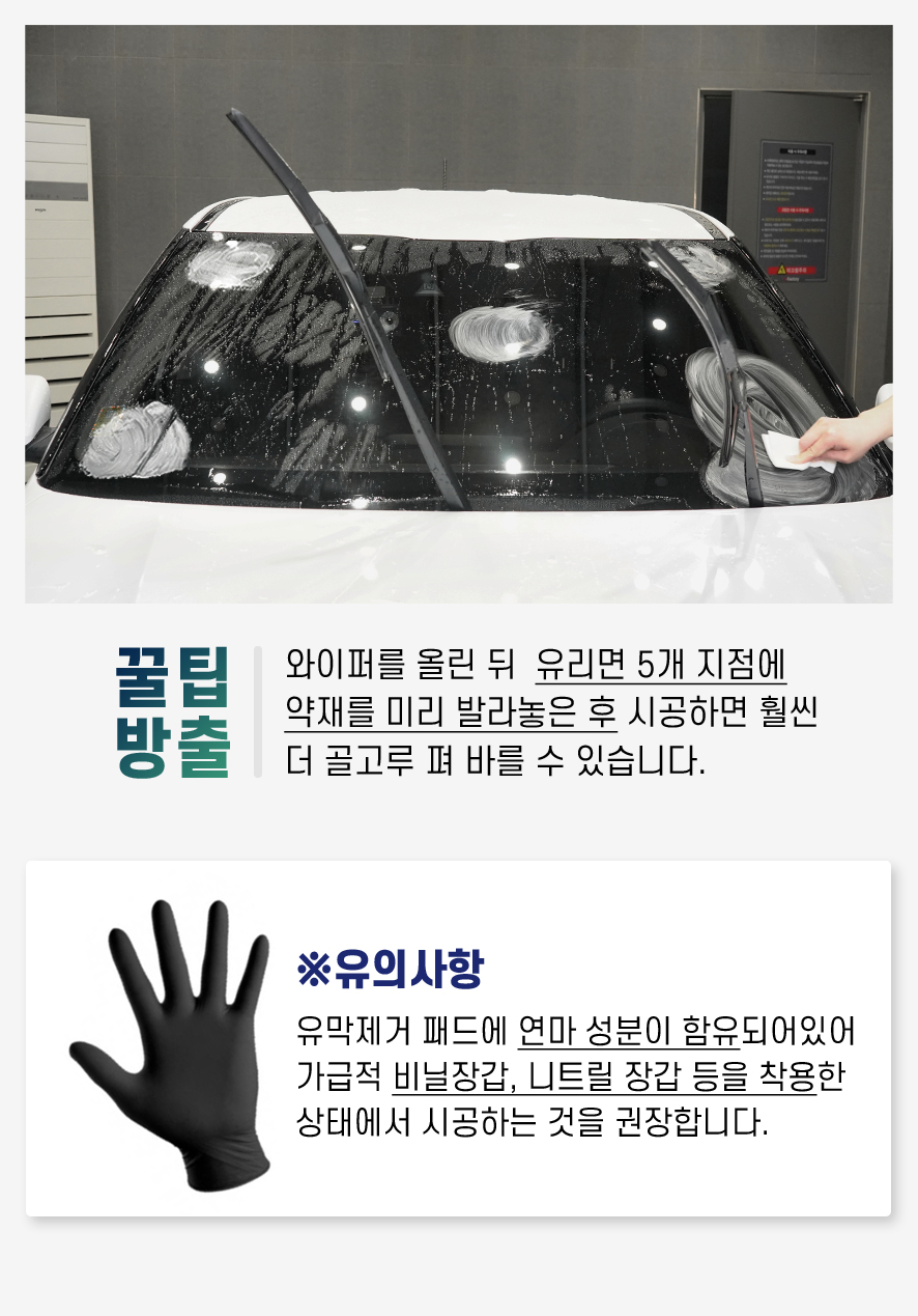 | 9. 사용상 주의사항 | 1. 자동차 실내에서는 사용하지 마세요. 2. 니트릴장갑 또는 비닐장갑 및 마스크를 착용하세요. 3. 밀폐된 공간에서 사용 시 환기를 충분히 하세요. 4. 어린이 손에 닿지 않는 곳에 보관하세요. 5. 개봉 후 내용물을 즉시 사용하세요. |