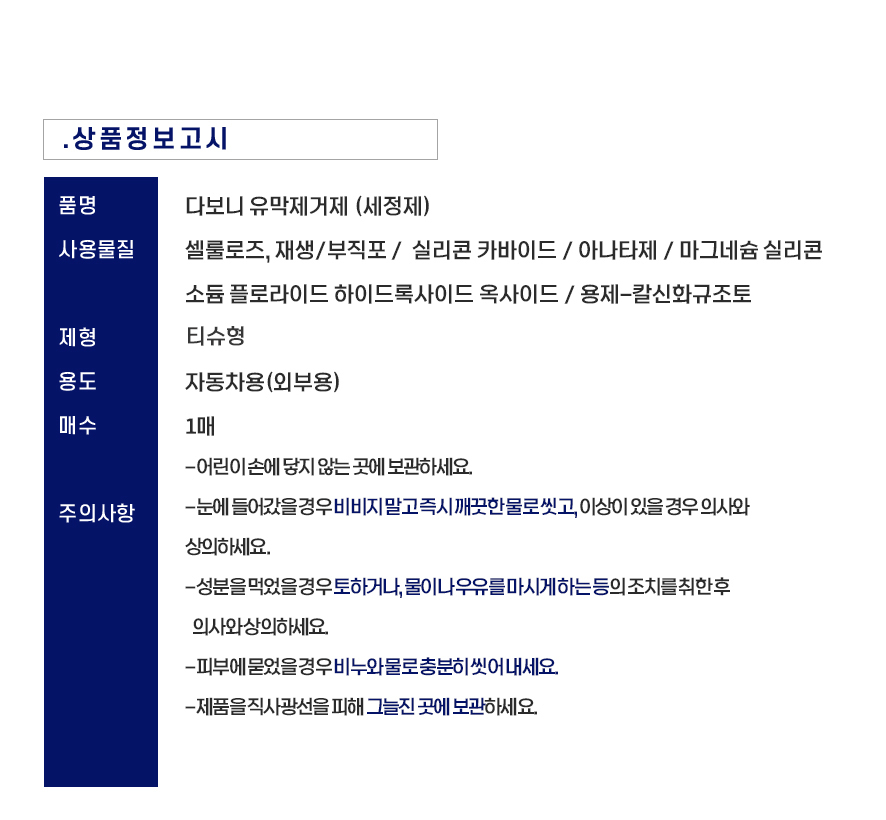 | 2. 용도(표백제의 경우 계열을 함께 표시) 및 제형 | 발수코팅제 : 광택코팅제 - 자동차용(외부용), 특수목적코팅제 - 자동차용(외부용) - 티슈형 유막제거제 : 세정제 - 티슈형 |