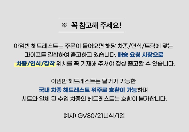 | 7. 적용차종 | 구매시, 배송메시지 입력란에 [연식/차종]순으로 작성해주시면 맞춰서 배송해드립니다. |