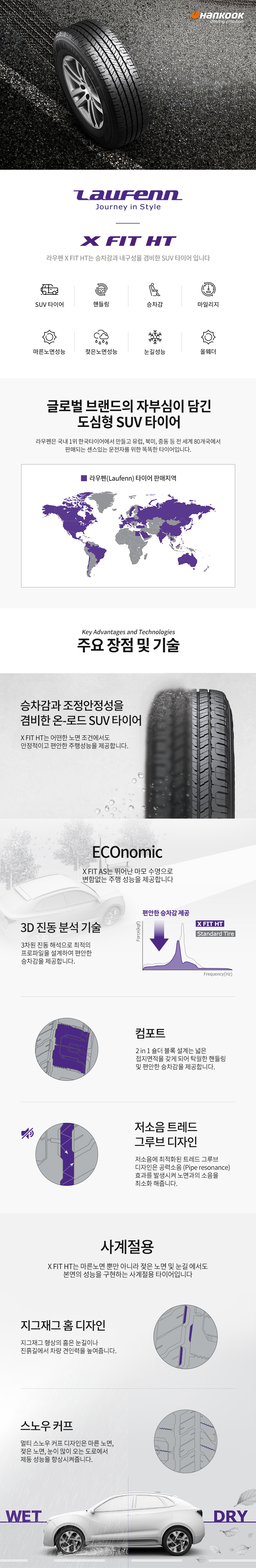 | 9. 품질보증기준 | "[적용 대상] -한국타이어가 제조 및 판매한 승용차용, 승합차용, 1.5톤 이하 경트럭용 타이어 해당 -잔여 그루브 깊이 20%(1.6mm) 이상 남은 타이어로 제조일로부터 6년 이내의 상품 [품질보증 제외사항] 1.고객 사용 과실인 경우 품질보증 대상에서 제외됩니다. -도로 상 위험요소에 의한 타이어 손상 (예. 외상/충격으로 인한 손상, 펑크 등) -부적절한 방법으로 휠&타이어 장착 및 타이어 상 개조, 수리한 흔적이 있는 경우 -휠 얼라인먼트 오류 등의 차량 관리 부족에 의한 타이어 손상, 이상마모, 조기마모 -공기압, 위치교환 등 타이어 및 부속품(휠, 밸브) 관리 부족에 의한 타이어 손상 -비정상적인 유통경로 및 중고로 구입하여 사용한 타이어 -부적절한 보관에 의한 타이어 손상 -한국타이어 권장 사용 용도를 따르지 않은 경우 -타이어 표기 규격 및 차량 제조업체의 규격을 초과하여 적재 또는 운행한 경우 -사고, 화재, 천재지변, 부주의 및 고의적 훼손에 의해 타이어가 손상된 경우 -마모율 80% 초과 또는 잔여 그루브 깊이가 마모한계(1.6 mm) 까지 사용한 경우 -부당한 목적으로 고품 타이어를 수집하여 보상 청구를 한 경우 -제조번호 (DOT 또는 시리얼코드 등) 를 확인 할 수 없는 경우 -특수 목적용으로 사용한 경우 (경주용 차량 및 트랙 경기용) -재생타이어 및 타이어 체인의 사용으로 인한 손상 -보증기간을 초과한 경우 2. 품질보증제도 시행 과정 중 발생되는 아래의 결과적 손실에 대해서는 적용되지 않습니다. -타이어 불편 및 검사에 의한 시간적 손실, 불편함 등 -차량 이동에 대한 서비스 비용(호출 전화비, 견인비용, 차량 렌트비용 등) -차량을 사용하지 못함으로 인한 손실: 이익, 수입, 기대 비용, 기업 신용 등 -부적절한 타이어 관리로 인해 발생된 어떠한 손상, 손실, 상처 등 [보상 기준] -교환: 마모율 10% 미만(교환 불가능 시 환불) -환불: 마모율 10% 이상 ~ 80% 미만 -환불 금액 산정 방식: 구입가 대비 잔여 그루브 깊이 비율로 환불 금액 산정 환불금액=*)구입가 x (잔여 그루브 깊이/신생품 그루브 깊이) x 100 *구입가: 구매 영수증에 표시된 금액 중 VAT를 포함한 금액(구매금액 확인 불가 시 한국타이어 판매가를 구입가로 산정) ※ 한국타이어 품질보증 제도 시행을 위해 고객은 아래 의무사항을 준수해야 합니다. -한국타이어가 인증/안내한 대리점으로 방문하여 타이어 제공 -구매영수증, 전산기록(대리점) 등 구매 관련 증빙 -적정한 타이어 점검/조사가 진행 될 수 있도록 협조 [유의사항] - 한국타이어가 제조 및 판매한 상품에 한해 품질보증 제도를 시행하며, 자동차 업체에서 장착 공급한 당사 상품에 대해서도 동일한 품질보증을 받을 수 있습니다. - 한국타이어는 공정거래위원회의 ‘소비자 분쟁 해결기준(고시 제2022-25호)’의 타이어 분쟁 해결기준에 의거하여 품질보증을 시행하고 있습니다." |