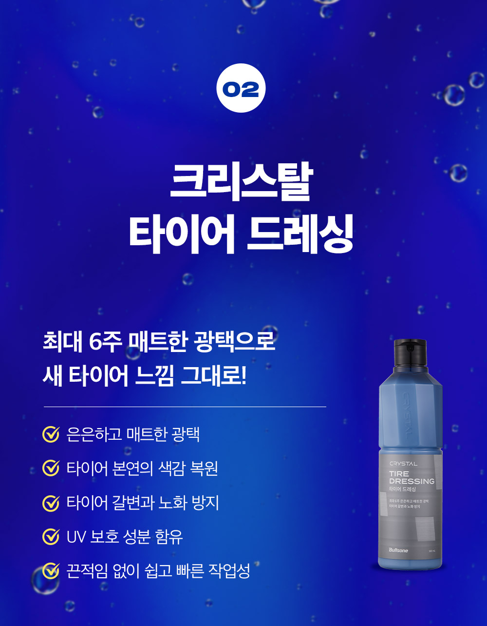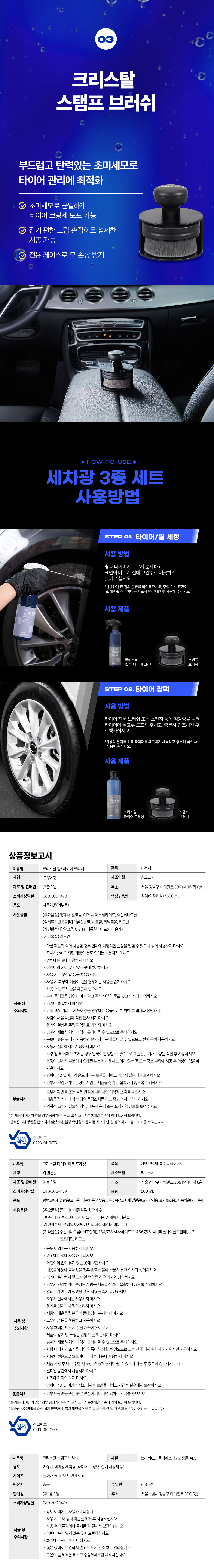| 4. 중량·용량·매수 | [타이어드레싱] 500 mL [휠&타이어크리너] 500 mL [스탬프브러쉬] |
