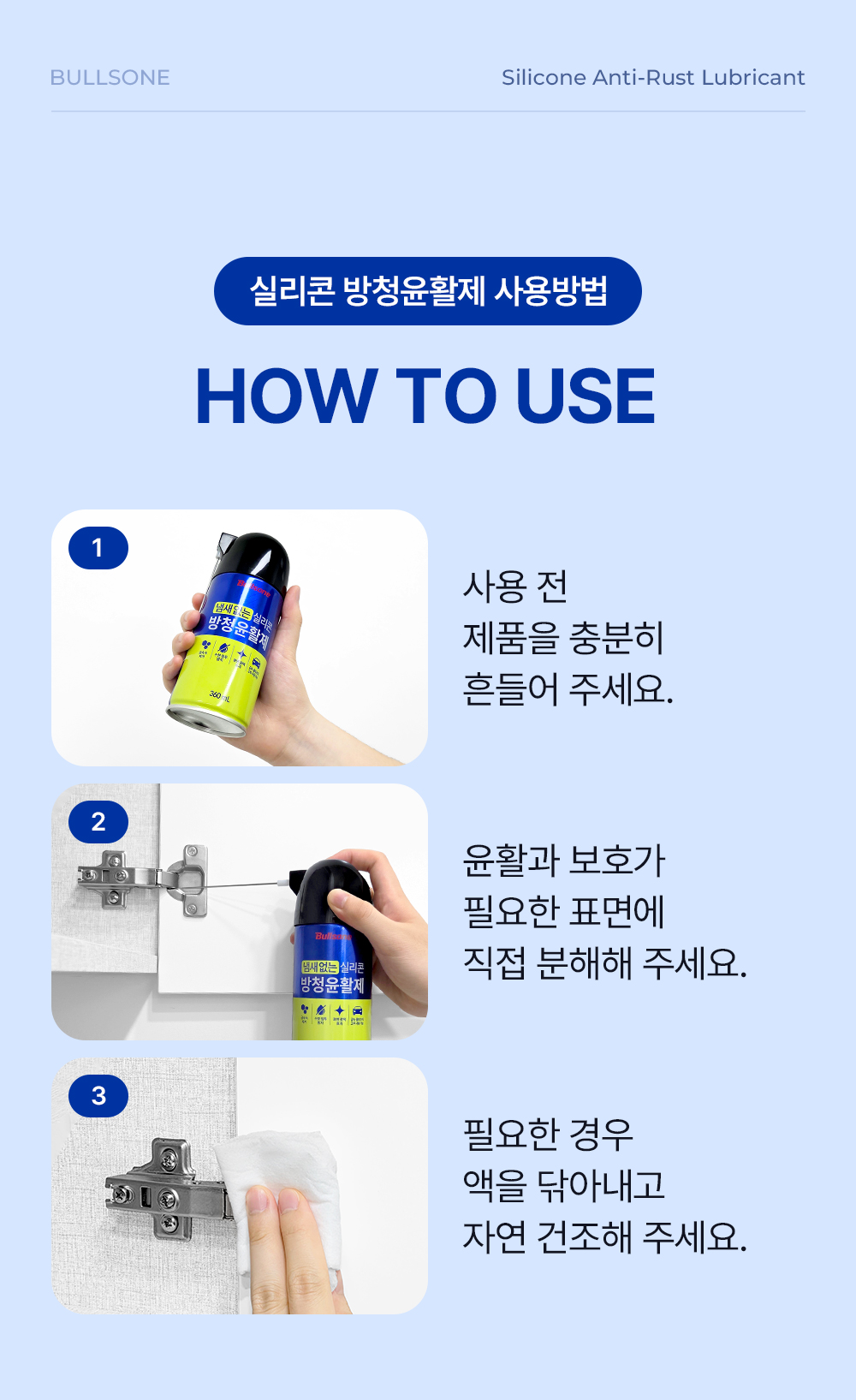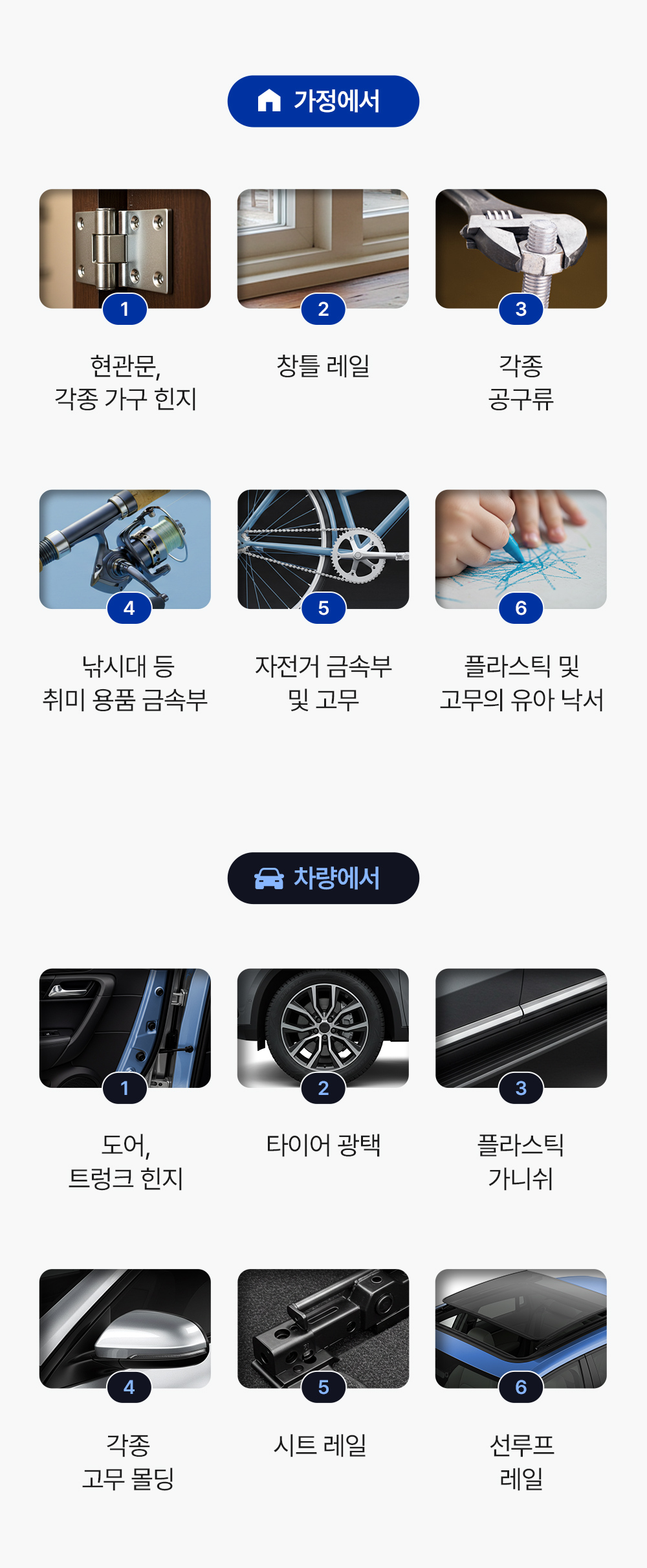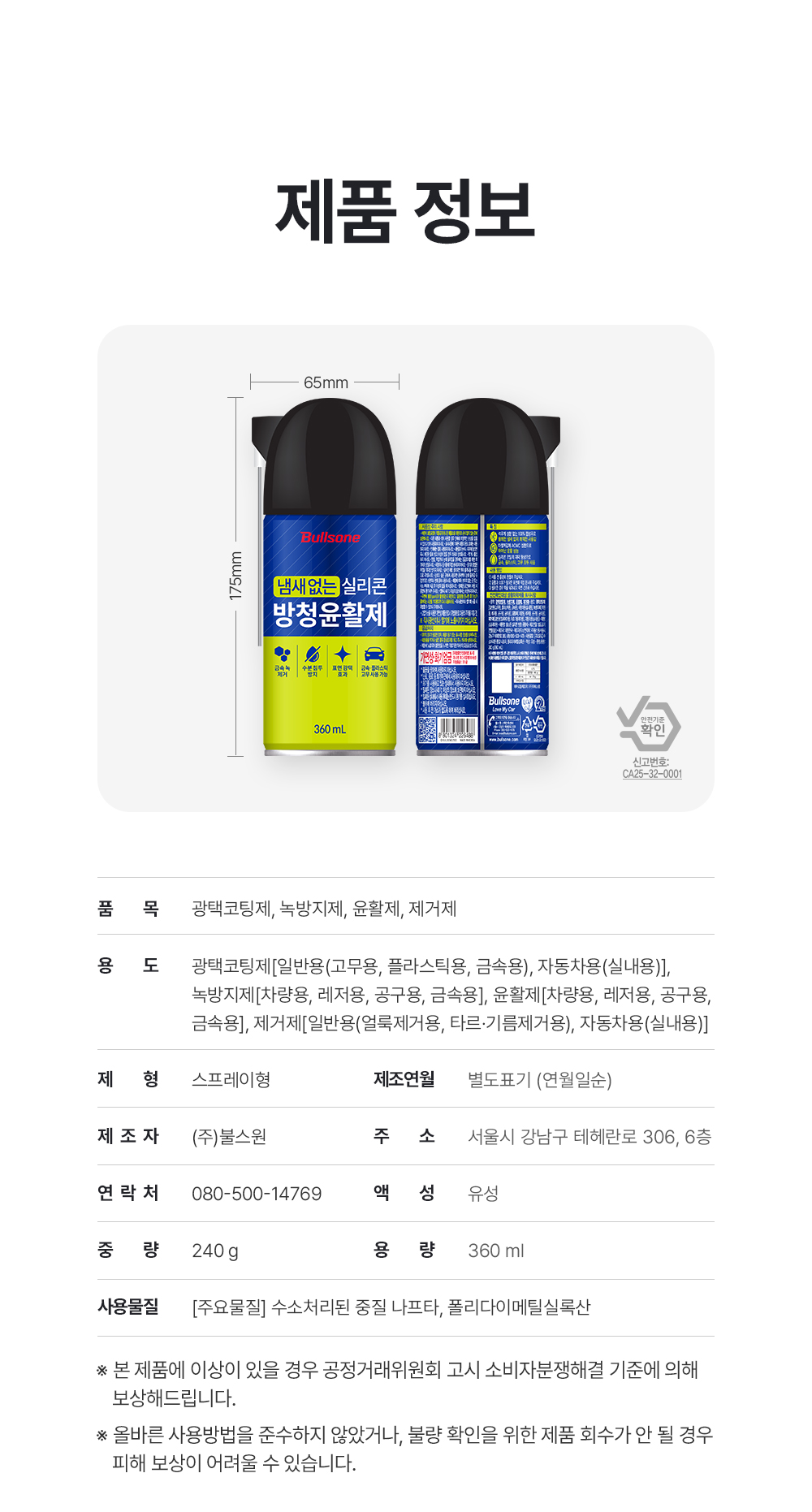| 2. 용도(표백제의 경우 계열을 함께 표시) 및 제형 | • 용도 : 광택코팅제[일반용(고무용, 플라스틱용, 금속용), 자동차용(실내용)], 녹방지제[차량용, 레저용, 공구용, 금속용], 윤활제[차량용, 레저용, 공구용, 금속용], 제거제[일반용(얼룩제거용, 타르·기름제거용), 자동차용(실내용)] • 제형 : 스프레이 |