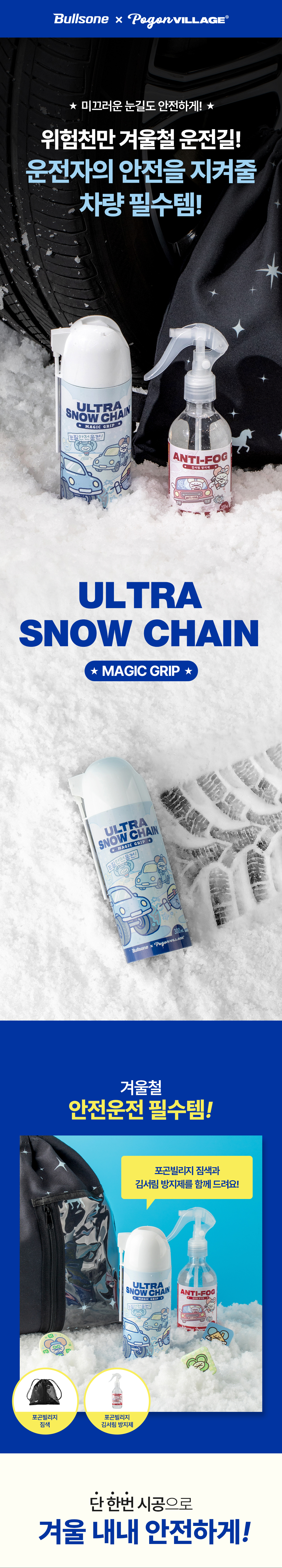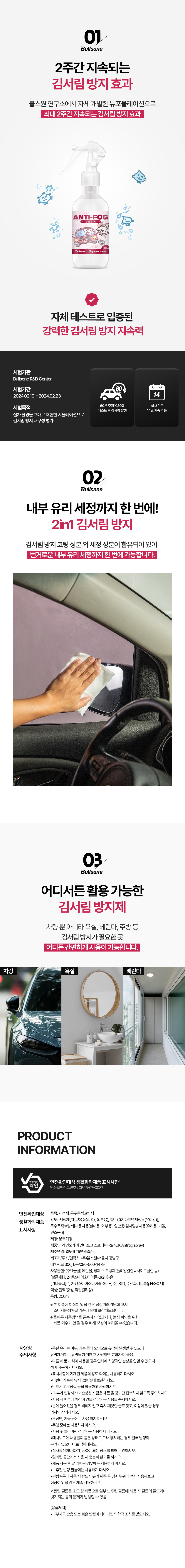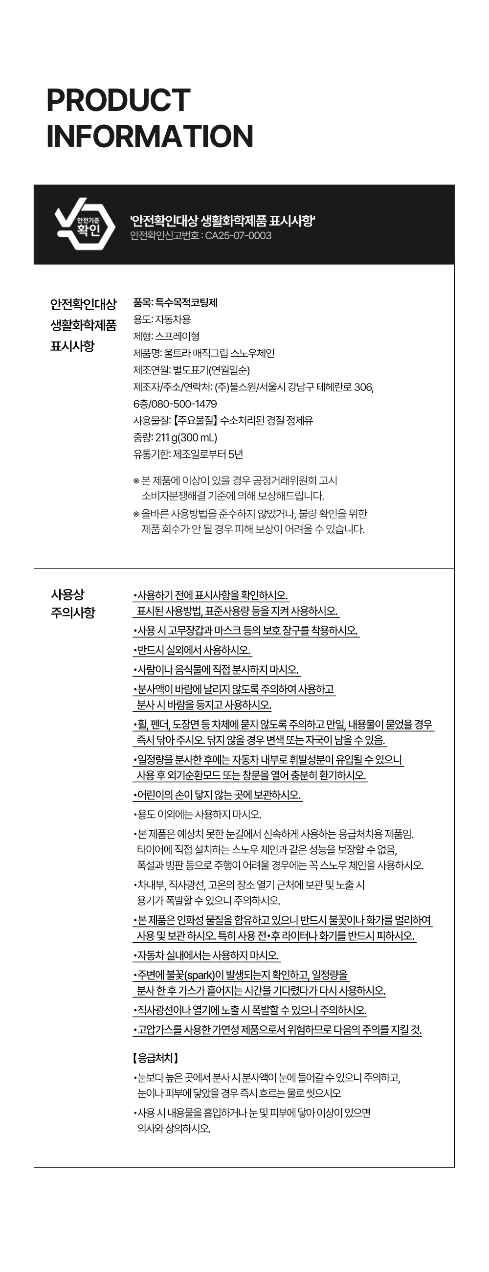 | 2. 용도(표백제의 경우 계열을 함께 표시) 및 제형 | [스노우체인] • 용도 : 자동차용 • 제형 : 스프레이형 [김서림방지] • 용도 : 세정제[자동차용(실내용, 외부용), 일반용(기타표면세정용(유리용)], 특수목적코팅제[자동차용(실내용, 외부용), 일반용(김서림방지용(유리용, 거울, 렌즈용))] • 제형 : 분무기형 |