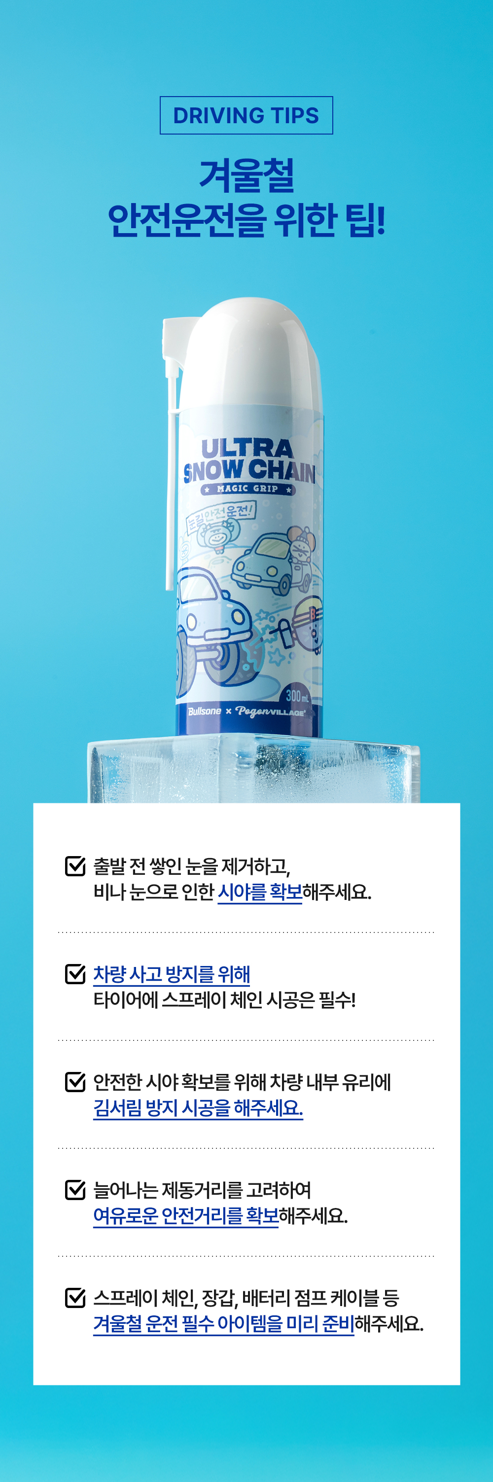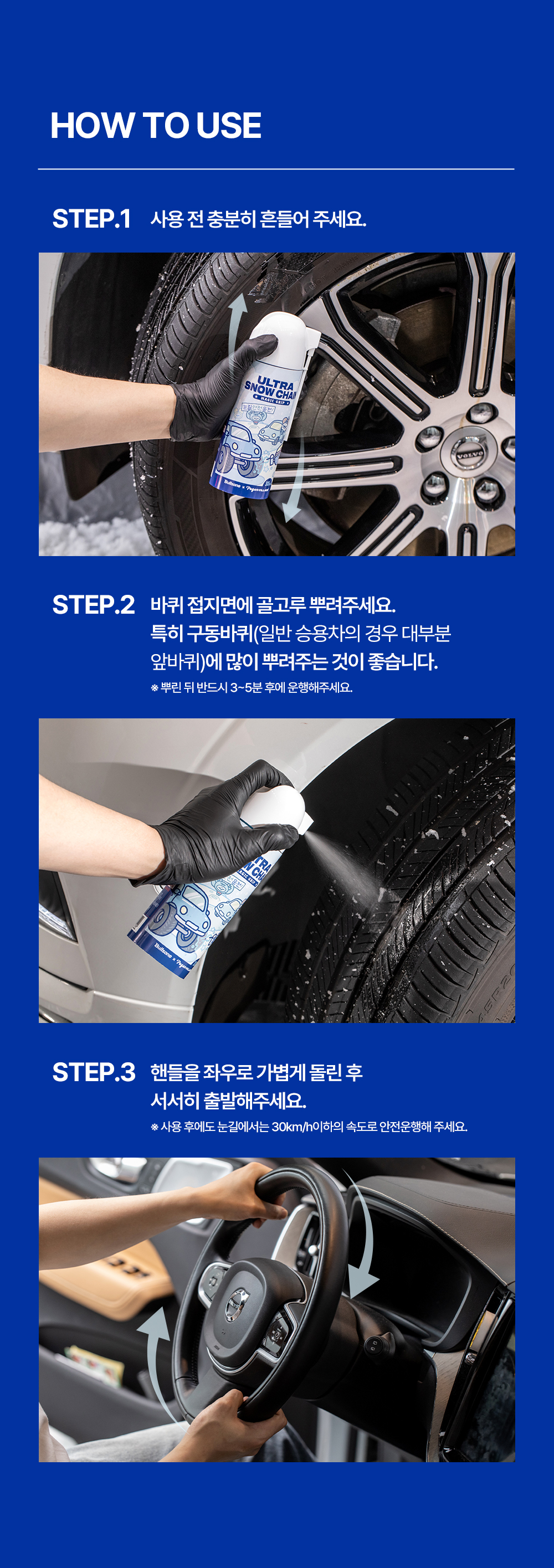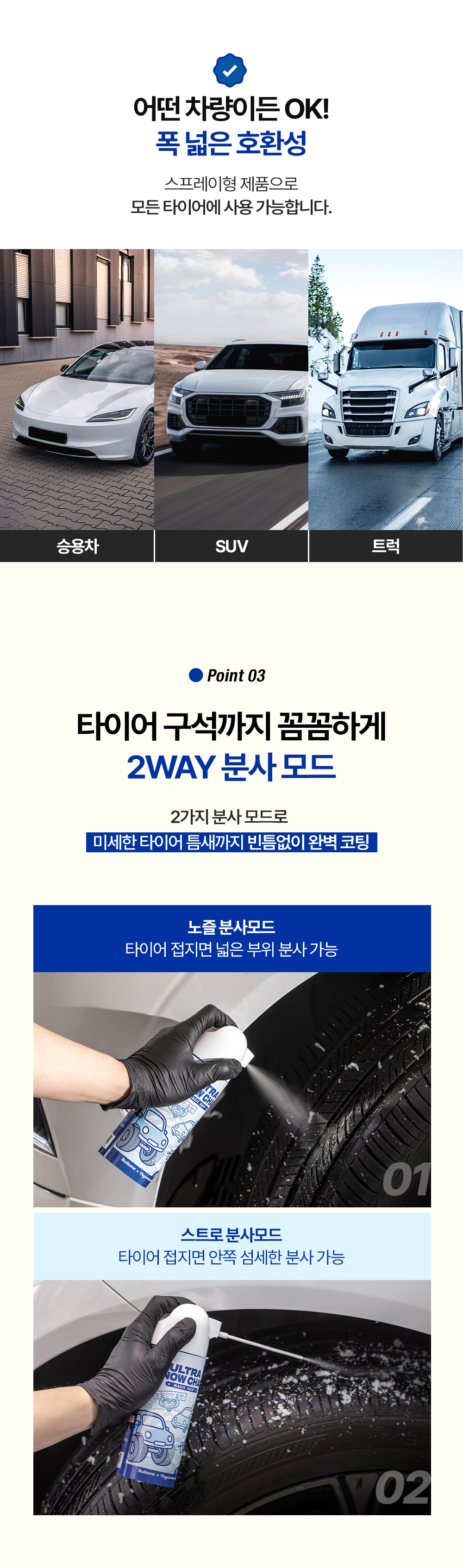 | 2. 용도(표백제의 경우 계열을 함께 표시) 및 제형 | [스노우체인] • 용도 : 자동차용 • 제형 : 스프레이형 [김서림방지] • 용도 : 세정제[자동차용(실내용, 외부용), 일반용(기타표면세정용(유리용)], 특수목적코팅제[자동차용(실내용, 외부용), 일반용(김서림방지용(유리용, 거울, 렌즈용))] • 제형 : 분무기형 |