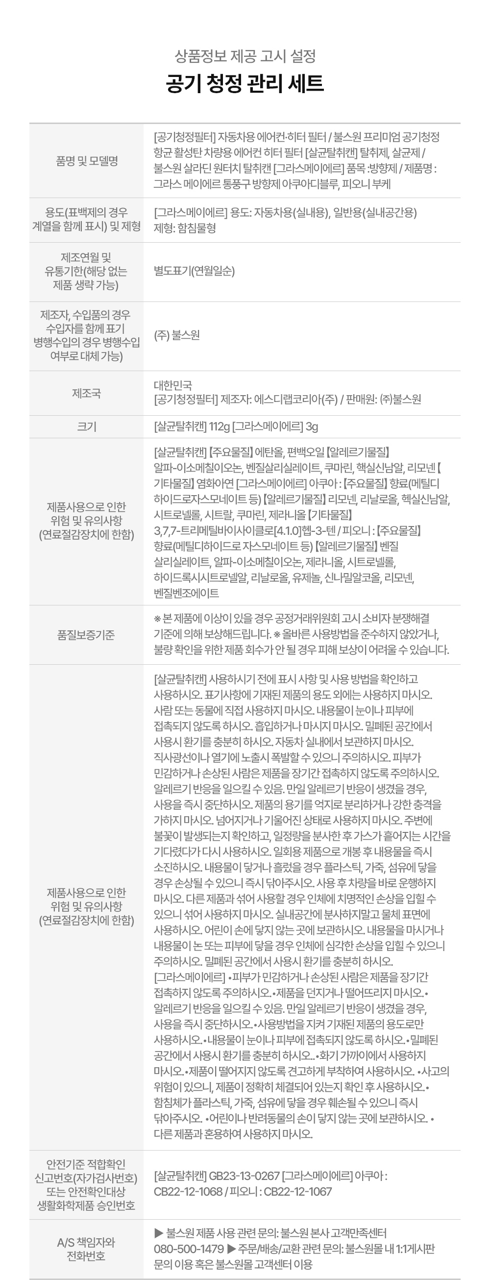 | 1. 품목 및 제품명 | [공기청정필터] 자동차용 에어컨·히터 필터 / 불스원 프리미엄 공기청정 항균 활성탄 차량용 에어컨 히터 필터 [살균탈취캔] 탈취제, 살균제 / 불스원 살라딘 원터치 탈취캔 [그라스메이에르] 품목 :방향제 / 제품명 : 그라스 메이에르 통풍구 방향제 아쿠아디블루, 피오니 부케 |