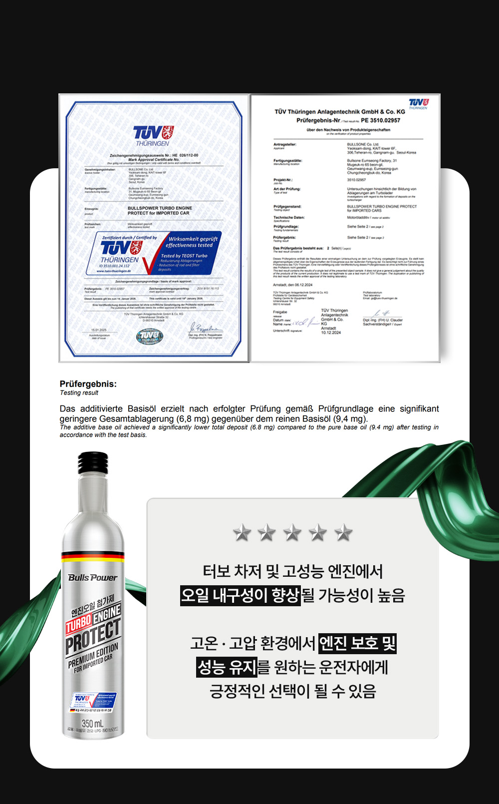 | 10. 검사합격증 번호(대기환경보전법에 따른 첨가제·촉매제에 한함) | [불스원샷] 대기환경보전법 시행규칙 별표 33의 첨가제 제조기준에 맞게 제조된 제품임. (Bullsoneshot Imported cars Diesel: 한국석유관리원 제19-첨가-018호 / Bullsoneshot Imported cars Gasoline : 한국석유관리원이사장 제 첨가 20-008호) |