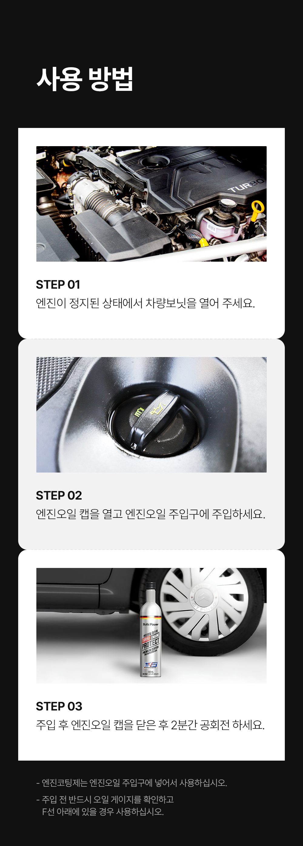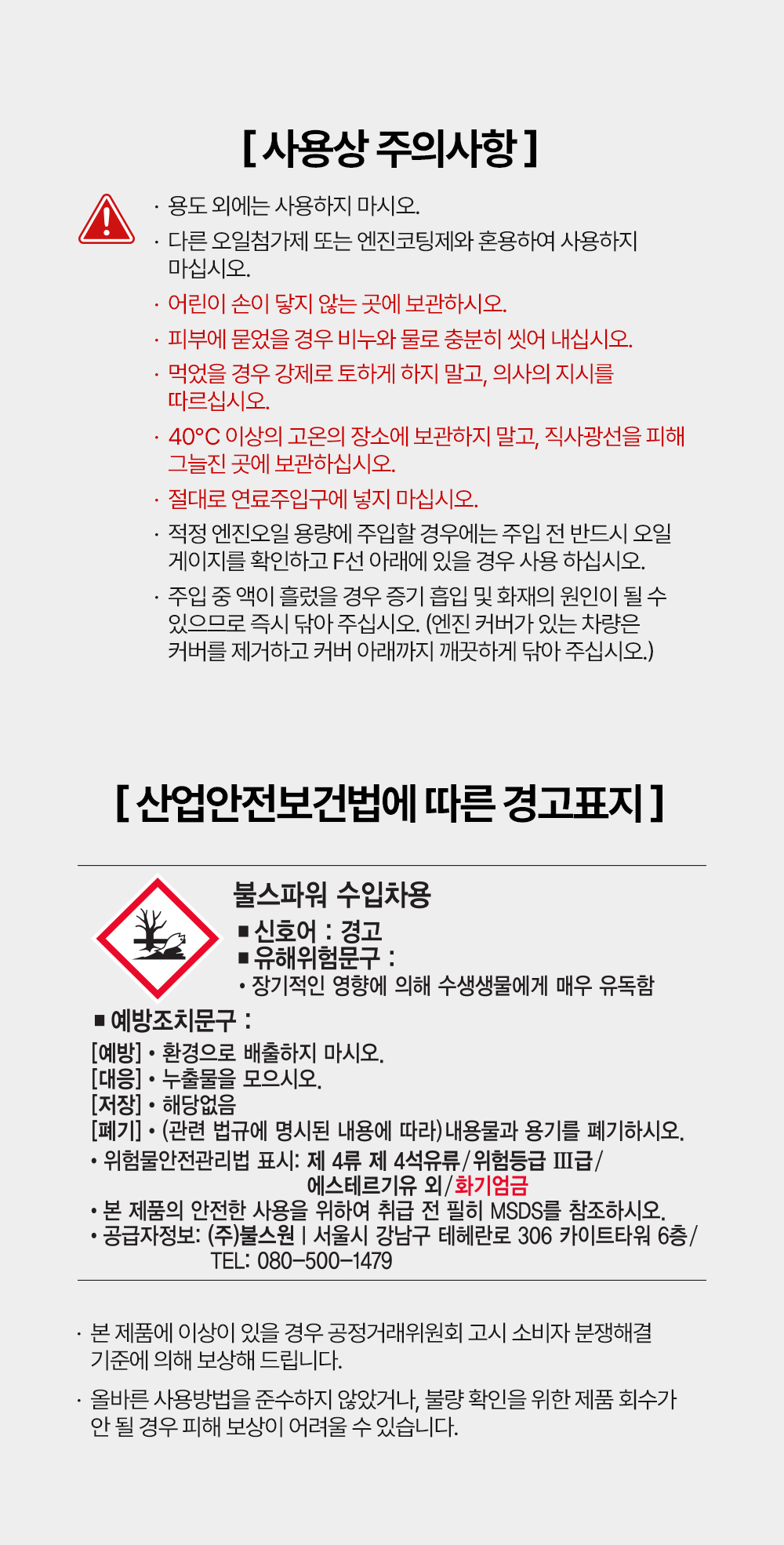 | 7. 적용차종 | [불스원샷] 경유차용(Diesel), 휘발유차용(Gasoline) [불스파워] 공용 (휘발유.경유.LPG.하이브리드) |