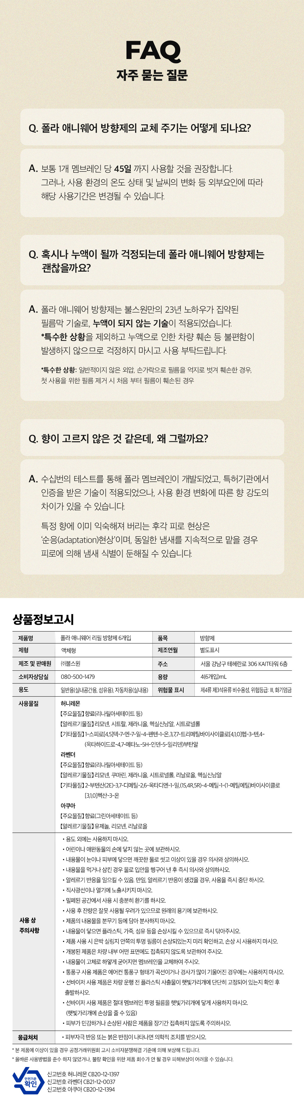 | 1. 품목 및 제품명 | • 품목 : 방향제 • 제품명 : 폴라 애니웨어 방향제 6P |