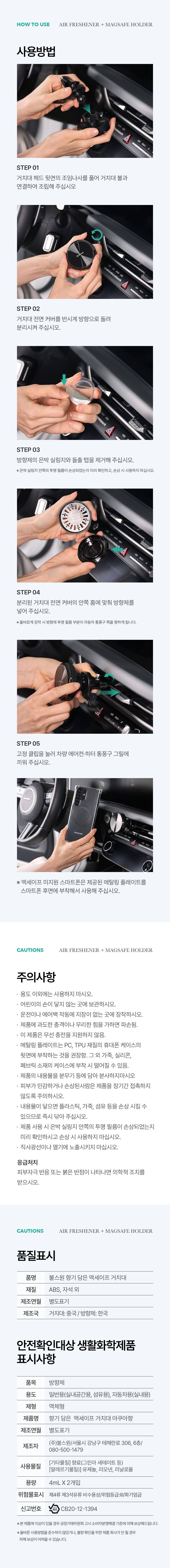 | 1. 품목 및 제품명 | • 품목 : 맥세이프 거치대 & 방향제 • 제품명 : 향기 담은 맥세이프 거치대 아쿠아향 • 출시일 : 2025년 5월 12일 |