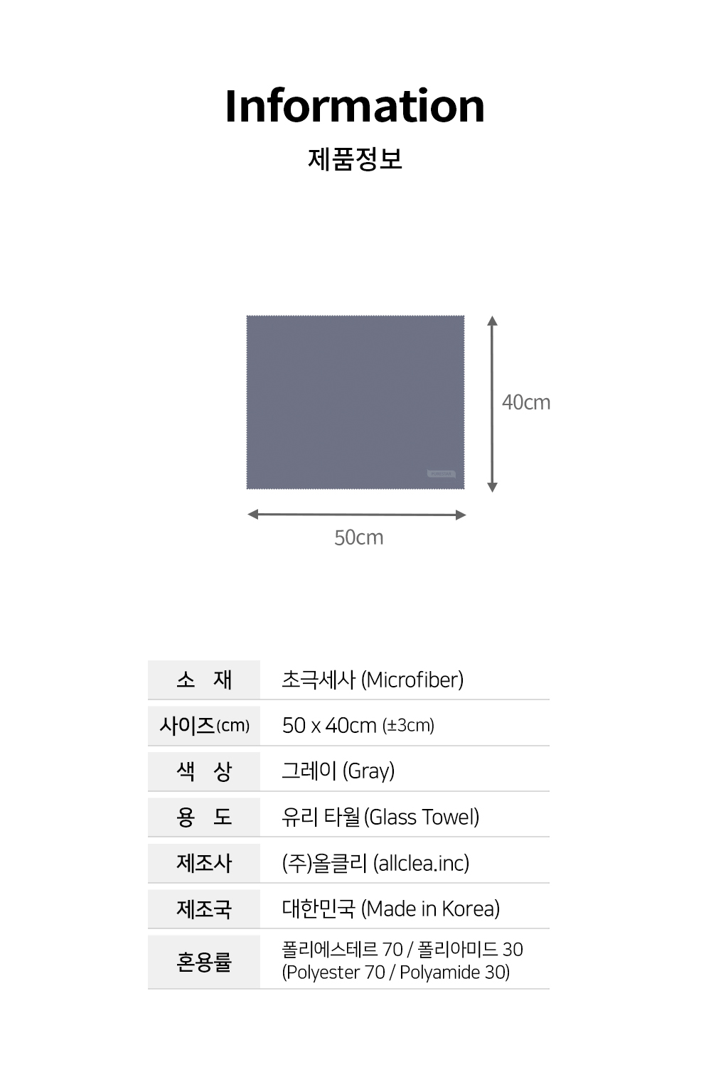 | 1. 품명 및 모델명 | [퓨어스타] 고밀도 실내유리 타월(그레이) |